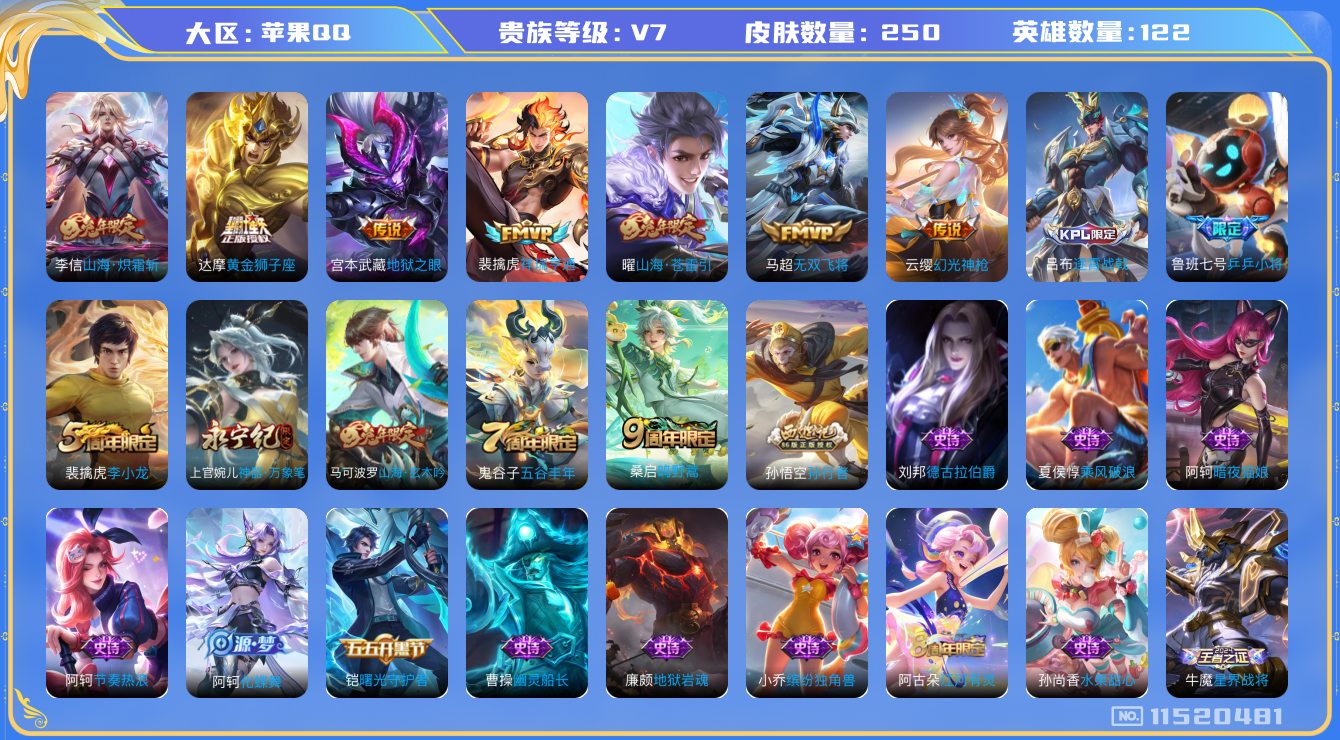 [11520481]V7 8传说 122英雄 250皮肤 可修改实名 女号 优质装备:黄金狮子座,地狱之眼,无双飞将,山海·炽霜斩(李信年限),山海·苍雷引(电光曜子) 传说皮:祥瑞亨通,幻光神枪 珍宝阁皮:妄想食味,胡桃夹子 限定皮:逐霄战戟,鸣野蒿,五谷丰年,李小龙,孙行者,乒乒小将,神器·万象笔,山海·玄木吟(马可年限) 史诗皮:器灵·浮梦炉,化蝶舞,龙之律动,雪豹·霜爪,星界战将,百相守梦-百里守约,紫霞仙子,黄金分割率,特工魅影,江河有灵,百解令(蒙犽),龙骑士(小龙虾),暗夜猫娘,蒙恬荣光圣徽,无限星赏官,晚萤,冰冠公主,末日机甲-吕布,节奏热浪,女仆咖啡,水果甜心,绅士熊喵,心灵骇客,功夫厨神,德古拉伯爵,暗隐猎兽者,幽灵船长,鬼剑武藏,心灵战警,舞动绿茵,地狱岩魂,拒霜思,缤纷独角兽,乘风破浪,逐浪之夏,水晶猎龙者,曙光守护者,热力回旋,金属风暴,原初追逐者,圣诞恋歌,鹰眼统帅,魅力维加斯,滕王阁序,无心,未来纪元-赵云,玫瑰异探