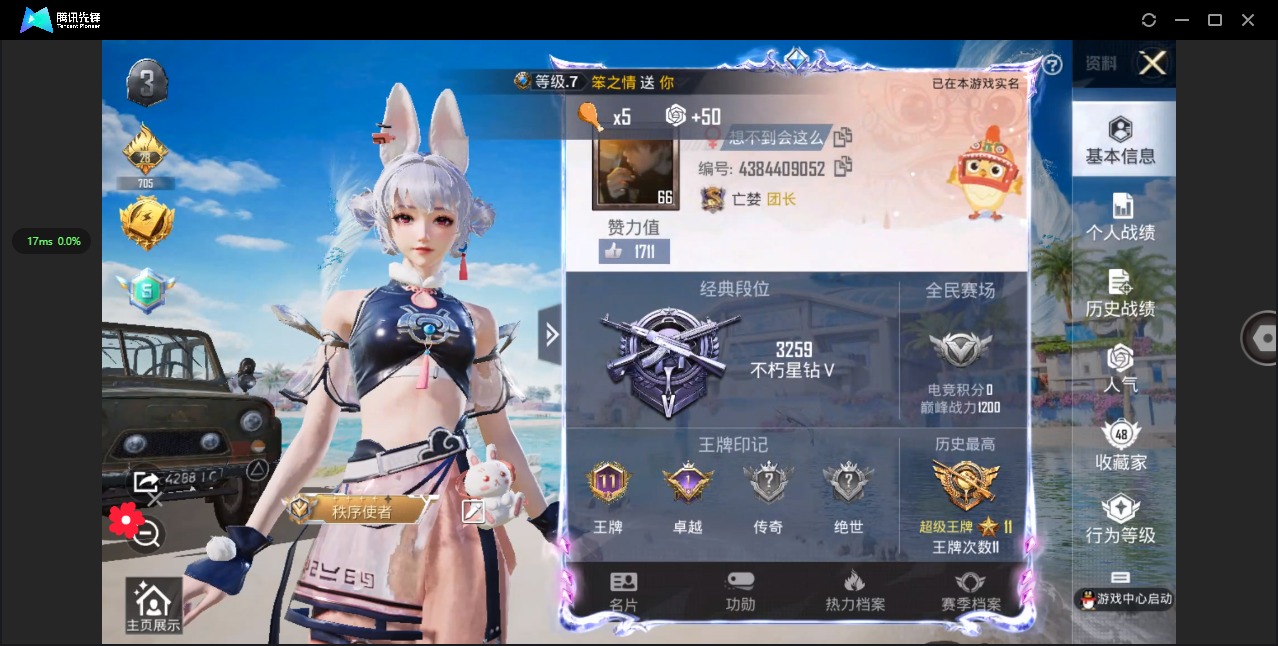 - [11604480]总资产:234 1干员外观 8传说枪械 可二次 可修改实名 烽火地带段位:铂金 全面战场段位:军士长 哈夫币:176 传说武器皮肤:AK-12突击步枪-夜鹰,SMG45冲锋枪-骑士,UZI冲锋枪-特斯拉线圈,SR-3M紧凑突击步枪-特斯拉线圈,AK-12突击步枪-特斯拉线圈,CAR-15突击步枪-阿米娅,725双管霰弹枪-送葬人-无题密令,勇士冲锋枪-能天使-午夜邮差 干员外观:露娜-黑·天际线