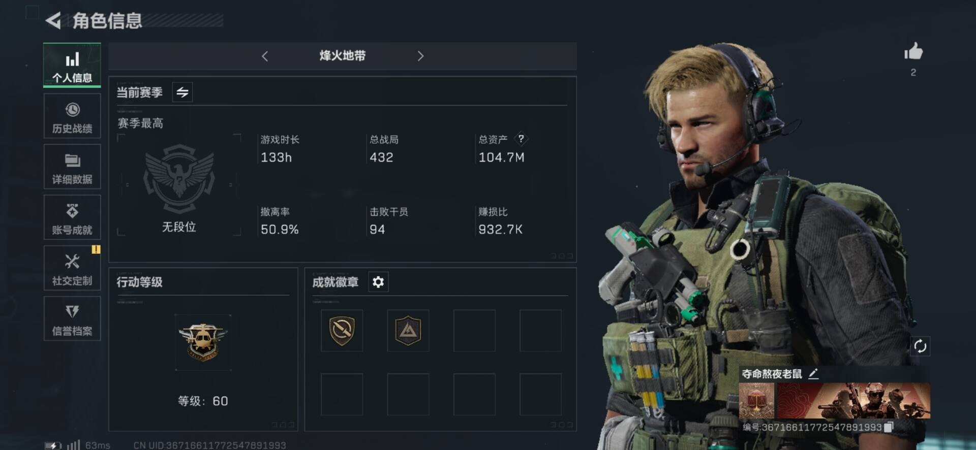 [11520687]总资产:104.7M 哈夫币:27.966K 可二次 可修改实名 烽火地带段位:无段位 全面战场段位:无段位