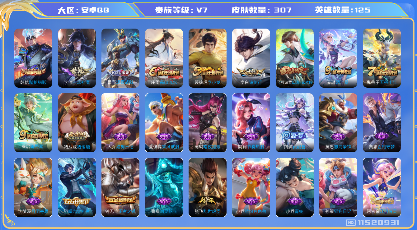 [11520931]V7 1典藏 3传说 125英雄 307皮肤 可修改实名 优质装备:弑枪猎影(韩信典藏),一念神魔 珍宝阁皮:万物之道,蔷薇恋人,女武神 限定皮:逐霄战戟,陌上桑,鸣野蒿,高山流水,诗剑行,五谷丰年,李小龙,猪悟能,山海·玄木吟(马可年限) 史诗皮:化蝶舞,星界战将,龙之律动,破空之剑,战舞者,怒海争锋,谪仙醉月,百相守梦-百里守约,百相守梦-黄忠,紫霞仙子,黄金分割率,江河有灵,百解令(蒙犽),蒙恬荣光圣徽,偶像歌手,龙骑士(小龙虾),暗夜猫娘,冰冠公主,青蛇,末日机甲-吕布,猫狗日记-孙策,猫狗日记-大乔,乱世虎臣,节奏热浪,女仆咖啡,摇滚巨星,水果甜心,天才门将,星夜王子,心灵骇客,功夫厨神,暗隐猎兽者,幽灵船长,鬼剑武藏,心灵战警,天秀·启明,舞动绿茵,纤云弄巧,繁星吟游(呼啦呼啦),拒霜思,缤纷独角兽,乘风破浪,逐浪之夏,月团寄思,水晶猎龙者,曙光守护者,金属风暴,原初追逐者,圣诞狂欢,圣诞恋歌,鹰眼统帅,王者之锤,魅力维加斯,黎明之约,奇遇舞章,无心,未来纪元-赵云