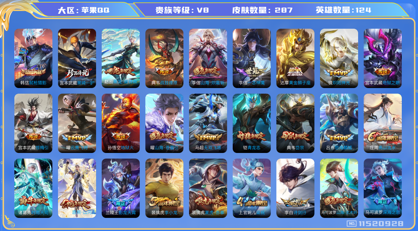[11520928]V8 1典藏 1珍品传说 23传说 124英雄 287皮肤 可修改实名 优质装备:弑枪猎影(韩信典藏),黑崎一护,黄金狮子座,云鹰飞将(小将军),炽阳神光,一念神魔,地狱火,地狱之眼,无双飞将,山海·炽霜斩(李信年限),山海·苍雷引(电光曜子),惊梅引 传说皮:乘龙·铭钟鼎(赵云年限),典韦战鼓燎原 珍宝阁皮:优雅恋人,蔷薇恋人,玩趣恶龙 限定皮:愿照·九州拓(澜年限),愿照·山河定(司空震年限),鸣野蒿,至尊宝,傲雪梅枪,时雨天司(水龙头),飞衡(韩信年限),影龙天霄,高山流水,诗剑行,齐天大圣,怒海麟威,五谷丰年,青龙志(铠年限),梁祝,岱宗(典韦年限),李小龙,孙行者,大圣娶亲,引擎之心,寅虎·赤拳(老虎年限),深海之息(深海大菠萝),山海·玄木吟(马可年限) 史诗皮:器灵·浮梦炉,星界战将,龙之律动,石田雨龙,茶境仙,怒海争锋,破空之剑,百相守梦-百里守约,百相守梦-黄忠,紫霞仙子,黄金分割率,特工魅影,千年之狐,江河有灵,百解令(蒙犽),蒙恬荣光圣徽,匿光破解者,偶像歌手,电玩·爆裂旋风,百相守梦(刘备),龙骑士(小龙虾),猫狗日记-孙策,乱世虎臣,节奏热浪,修罗,女仆咖啡,摇滚巨星,水果甜心,星夜王子,功夫厨神,德古拉伯爵,暗隐猎兽者,幽灵船长,鬼剑武藏,暗渊魔法,心灵战警,舞动绿茵,地狱岩魂,拒霜思,乘风破浪,水晶猎龙者,热力回旋,金属风暴,原初追逐者,圣诞恋歌,鹰眼统帅,魅力维加斯,赏金猎手,无心,未来纪元-赵云