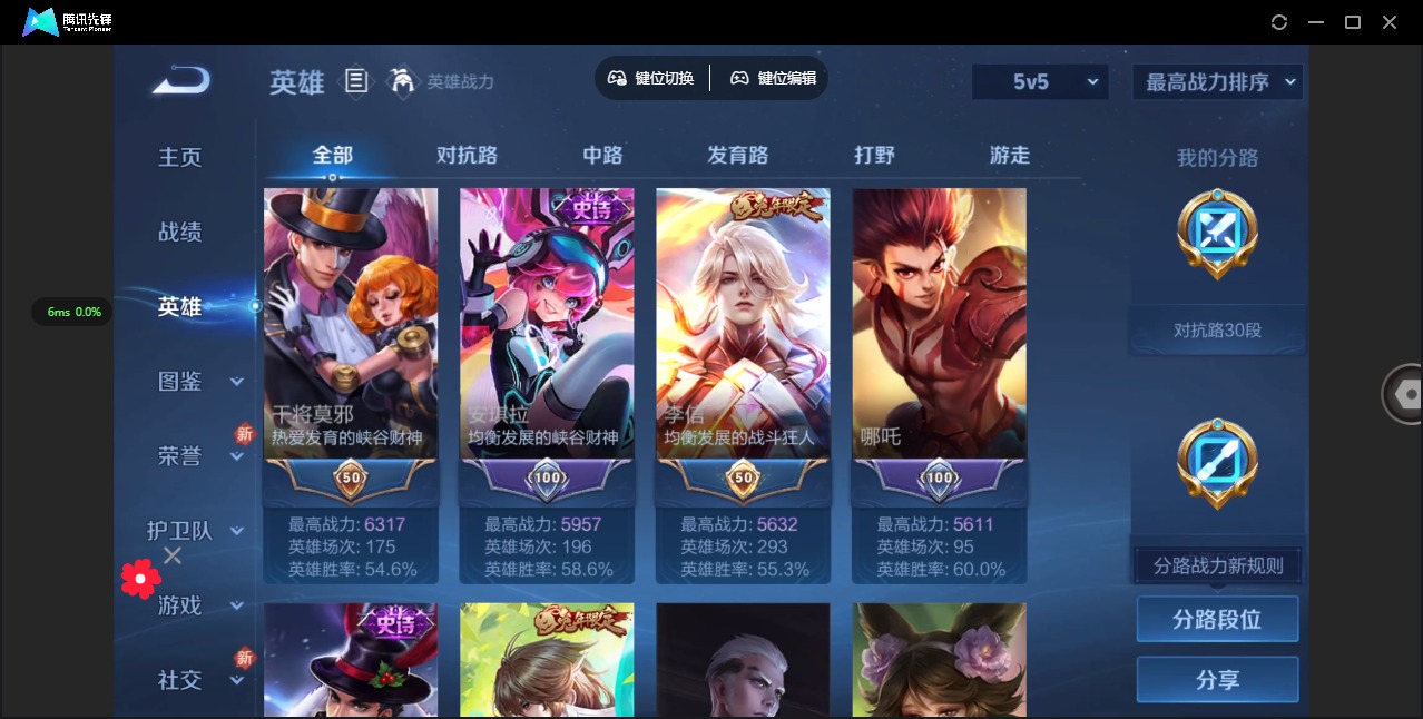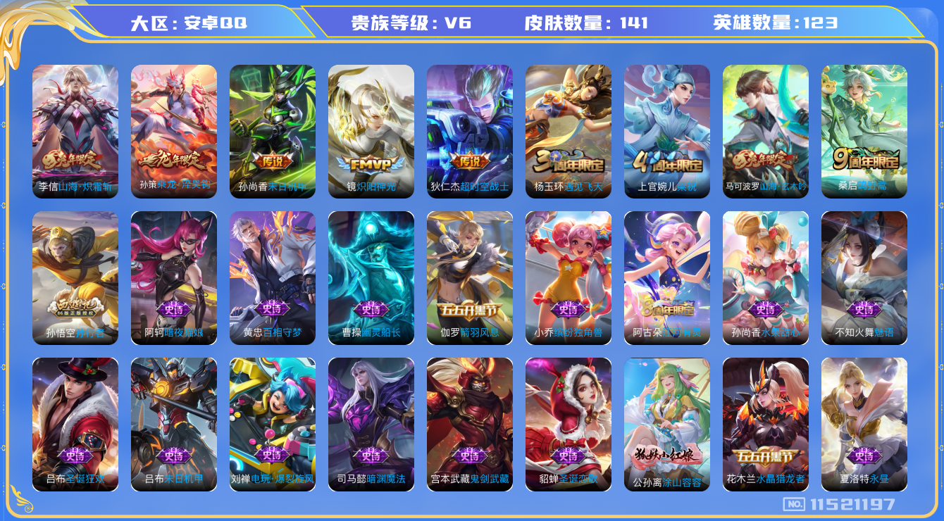 [11521197]V6 6传说 123英雄 141皮肤 可修改实名 优质装备:炽阳神光,末日机甲-孙尚香(绿蚂蚱),超时空战士-狄仁杰,山海·炽霜斩(李信年限),涂山容容 传说皮:乘龙·淬吴钩(孙策年限) 珍宝阁皮:胡桃夹子 限定皮:鸣野蒿,遇见飞天,梁祝,孙行者,山海·玄木吟(马可年限) 史诗皮:百相守梦-黄忠,永昼,江河有灵,魅语,蒙恬荣光圣徽,冰冠公主,电玩·爆裂旋风,暗夜猫娘,末日机甲-吕布,女仆咖啡,水果甜心,星夜王子,心灵骇客,功夫厨神,幽灵船长,鬼剑武藏,暗渊魔法,心灵战警,缤纷独角兽,逐浪之夏,水晶猎龙者,箭羽风息,金属风暴,原初追逐者,圣诞狂欢,圣诞恋歌,鹰眼统帅,魅力维加斯,黎明之约,未来纪元-赵云