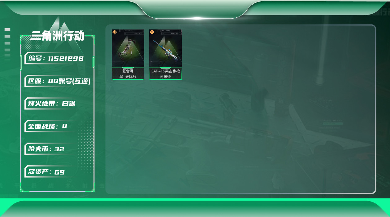 [11521298]总资产:69.1 2传说枪械 进阶安全箱(2×2)9.15号到期 可二次 可修改实名 烽火地带段位:白银 全面战场段位:上等兵 哈夫币:32.157 传说武器皮肤:复合弓-黑-天际线,CAR-15突击步枪-阿米娅