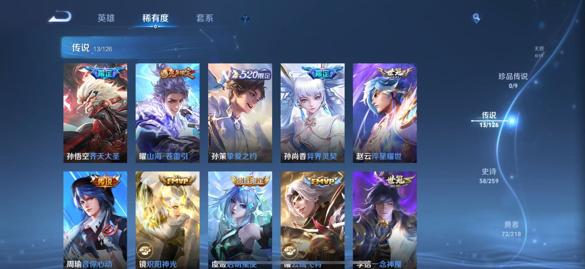 - [11609170]V7 1典藏 7传说 124英雄 337皮肤 可修改实名 优质装备:神鉴启示录,地狱之眼,霜月吟,涂山容容 传说皮:幻光神枪 珍宝阁皮:万物之道,蔷薇恋人,女武神 限定皮:愿照·九州拓(澜年限),逐霄战戟,鸣野蒿,傲雪梅枪,神威(电光马子),遇见飞天,高山流水,怒海麟威,五谷丰年,天狼狩猎者,岱宗(典韦年限),李小龙,猪悟能,大圣娶亲,寅虎·赤拳(老虎年限),神器·万象笔 史诗皮:鸭鸭历险记-刘禅,飞车小橘子,器灵·浮梦炉,化蝶舞,星界战将,谪仙醉月,龙之律动,石田雨龙,百相守梦-周瑜,茶境仙,破空之剑,蔬乡物语(鲁班七号),百相守梦-百里守约,百相守梦-黄忠,遇见神鹿,电玩小子(小书包),黄金分割率,特工魅影,千年之狐,江河有灵,匿光侦查者,魅语,百解令(蒙犽),高渐离燃音魔法,蒙恬荣光圣徽,无限星赏官,冰冠公主,白蛇,晚萤,电玩·爆裂旋风,百相守梦(刘备),末日机甲-吕布,猫狗日记-孙策,猫狗日记-大乔,时之恋人-孙尚香,乱世虎臣,节奏热浪,修罗,女仆咖啡,摇滚巨星,水果甜心,绅士熊喵,天才门将,星夜王子,心灵骇客,功夫厨神,德古拉伯爵,暗隐猎兽者,幽灵船长,鬼剑武藏,心灵战警,舞动绿茵,地狱岩魂,纤云弄巧,繁星吟游(呼啦呼啦),拒霜思,缤纷独角兽,乘风破浪,逐浪之夏,水晶猎龙者,曙光守护者,箭羽风息,唤灵魅影,金属风暴,原初追逐者,圣诞狂欢,圣诞恋歌,鹰眼统帅,暗夜贵公子,魅力维加斯,黎明之约,滕王阁序,无心,未来纪元-赵云