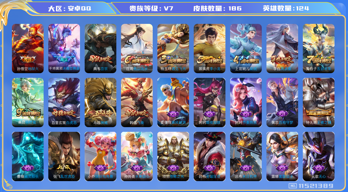 [11521389]V7 4传说 124英雄 186皮肤 可修改实名 优质装备:地狱火 珍宝阁皮:蔷薇恋人,玩趣恶龙 限定皮:鸣野蒿,白虎志(电光耗子),凤求凰(白切鸡),神威(电光马子),飞衡(韩信年限),遇见飞天,高山流水,五谷丰年,梁祝,岱宗(典韦年限),李小龙,冰霜恋舞曲 史诗皮:龙之律动,百相守梦-黄忠,紫霞仙子,苍穹之光,白龙吟,千年之狐,偶像歌手,龙骑士(小龙虾),暗夜猫娘,末日机甲-吕布,乱世虎臣,节奏热浪,修罗,女仆咖啡,摇滚巨星,水果甜心,心灵骇客,暗隐猎兽者,幽灵船长,鬼剑武藏,心灵战警,纤云弄巧,缤纷独角兽,乘风破浪,逐浪之夏,水晶猎龙者,金属风暴,圣诞狂欢,鹰眼统帅,王者之锤,魅力维加斯,无心,未来纪元-赵云