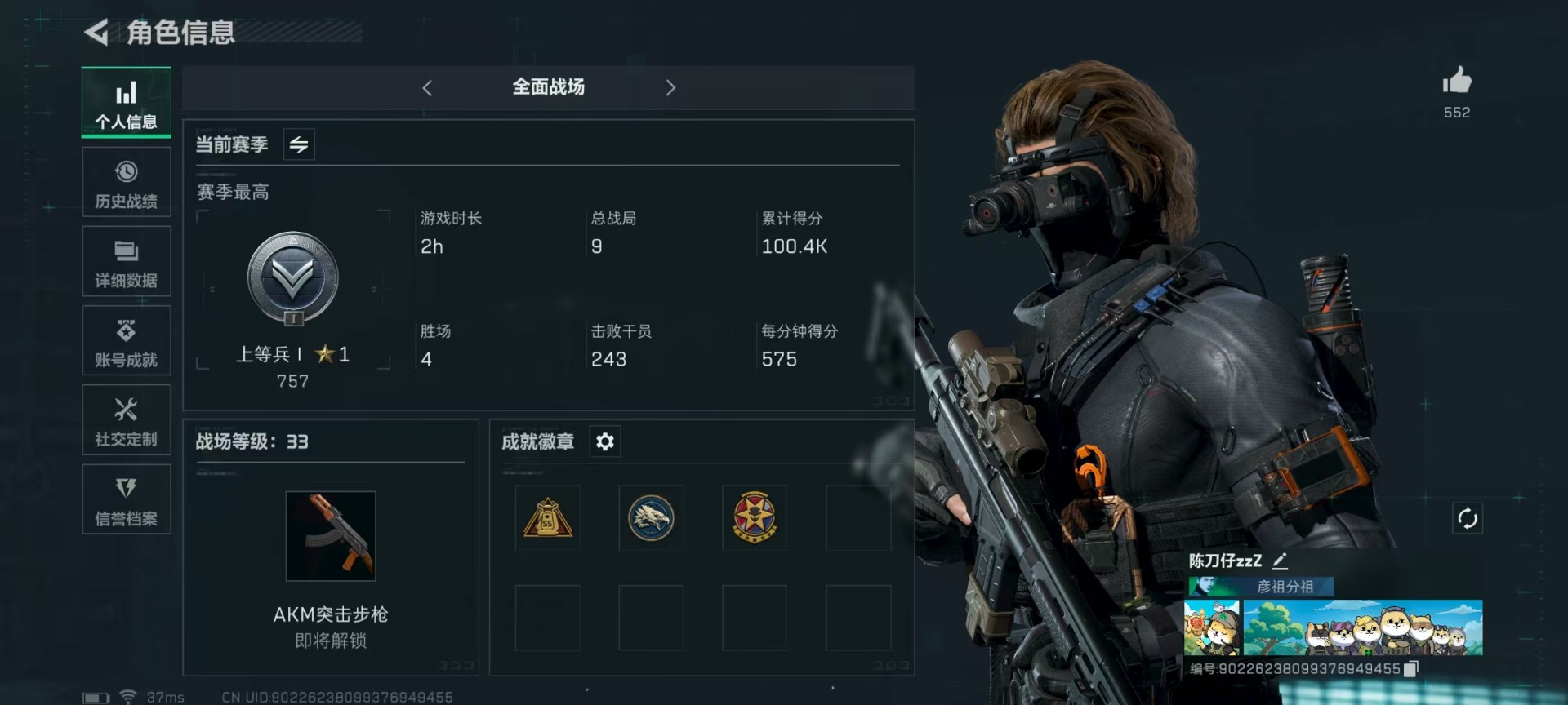 - [11445823]总资产:34.3M 3传说枪械 哈夫币:4.515K 高级安全箱(9.17到期) 可二次 可修改实名 烽火地带段位:黄金 全面战场段位:列兵 传说武器皮肤:复合弓-黑-天际线,勇士冲锋枪-能天使-午夜邮差,725双管霰弹枪-送葬人-无题密令
