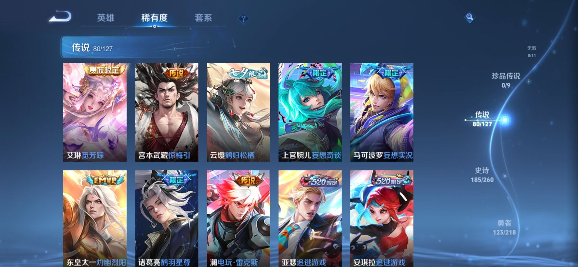 - PX_2095414-07 安卓QQ/非凡王者/182皮肤/123英雄/1典藏/0珍品无双/0无双/3珍品传说/11传说/47史诗/7稀有英雄 【3 珍品传说】酷洛米之心 安琪拉,大耳狗之梦 瑶,兔狲·蓬尾 张飞, 【1 典藏皮肤】拾光映像 瑶, 【11 传说皮肤】逐花归海 澜,时之祈愿 瑶,祈雪灵祝 公孙离,至美·化雀舞 甄姬,妄想实况 马可波罗,黄金白羊座 张良,愿照·众生和 妲己,愿照·福禄