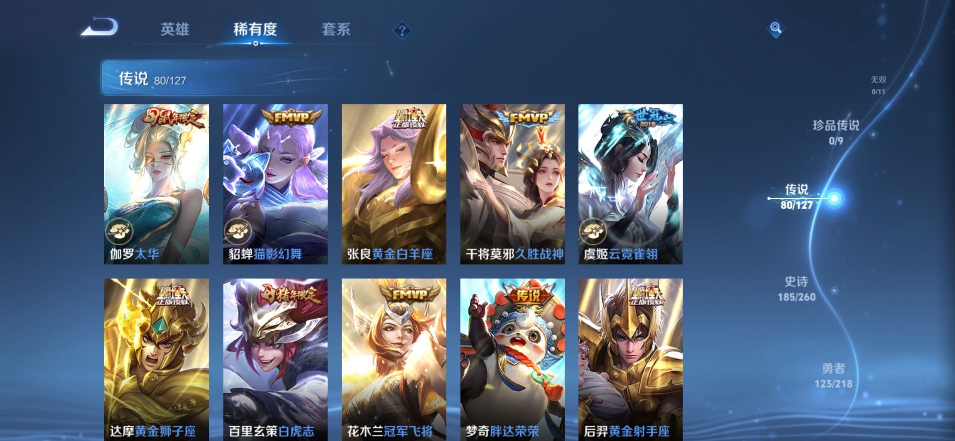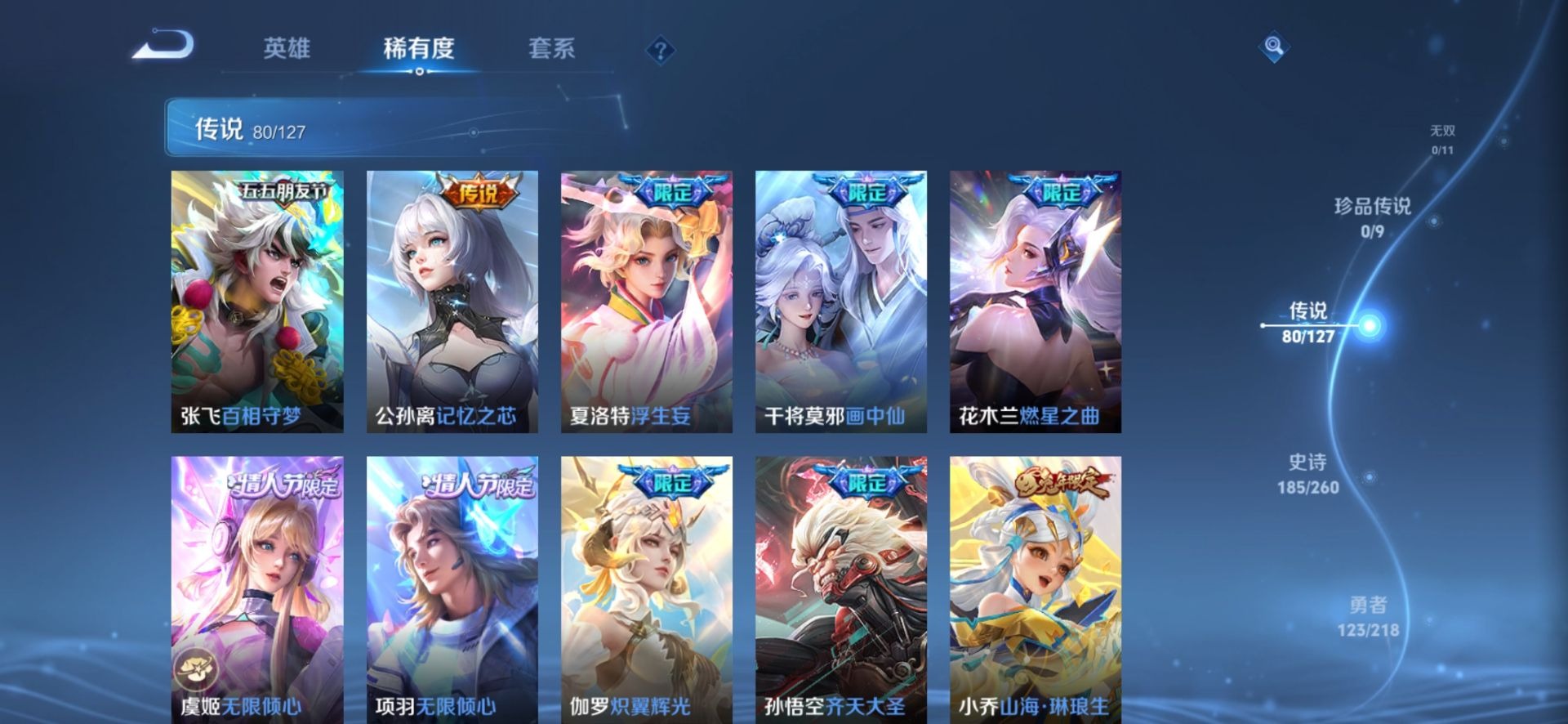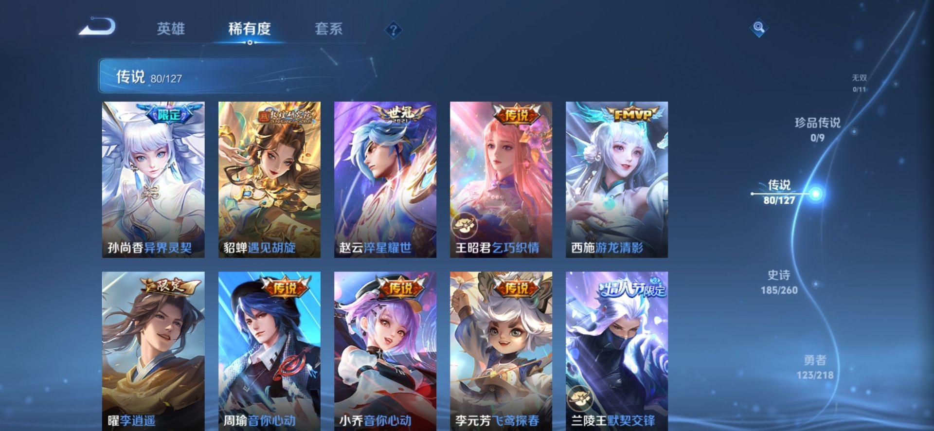 大乔白鹤梁神女,金蝉唐三藏,黄忠烈魂,甄姬幽恒,甄姬女儿国国王,盾山梦圆繁星,铠青龙志,廉颇寅虎·御盾,曹操天狼征服者,伽罗天狼溯光者,伽罗太华,苏烈玄武志,张飞虎魄,赵云龙胆,孙膑天狼运算者,孙膑寅虎·展翼,干将莫邪冰霜恋舞曲,小乔纯白花嫁,典韦岱宗,孙尚香异界灵契,不知火舞绯月行,牛魔奔雷神使,鲁班七号乒乒小将,项羽霸王别姬,鲁班七号寅虎·瑞焰,后羿无尽星芒,吕布御风骁将,后羿如梦令,后羿辉光之辰,露娜一生所爱,庄周玄嵩,镜匿光追影者,庄周云端筑梦师,周瑜真爱至上,诸葛亮时雨天司,杨玉环寅虎·心曲,兰陵王默契交锋,公孙离祈雪灵祝,公孙离蜜橘之夏,鲁班大师匿光启智者,裴擒虎李小龙,裴擒虎天狼狩猎者,裴擒虎寅虎·赤拳,东皇太一逐梦之光,上官婉儿梁祝,上官婉儿神器·万象笔,上官婉儿天狼绘梦者,李白诗剑行,花木兰默契交锋,花木兰瑞麟志,花木兰青春决赛季,安琪拉魔法小厨娘,马可波罗逐梦之星,马可波罗山海·玄木吟,马可波罗深海之息,猪八戒猪悟能,孙悟空孙行者,孙悟空大圣娶亲,芈月白晶晶,孙悟空至尊宝,百里玄策白虎志,马超神威,雅典娜神奇女侠,赵云引擎之心,盘古冰霜神祇,云中君时之祈愿,妲己时之彼端,妲己时之奇旅,韩信傲雪梅枪,韩信飞衡,韩信逐梦之影,百里守约朱雀志,蔡文姬奇迹圣诞,墨子降魔,瑶时之祈愿,瑶山海·碧波行,虞姬霸王别姬,娜可露露前尘镜,妲己热情桑巴,王昭君凤凰于飞,嫦娥如梦令,王昭君星穹之声,关羽武圣,关羽冰锋战神,橘右京枫霜尽