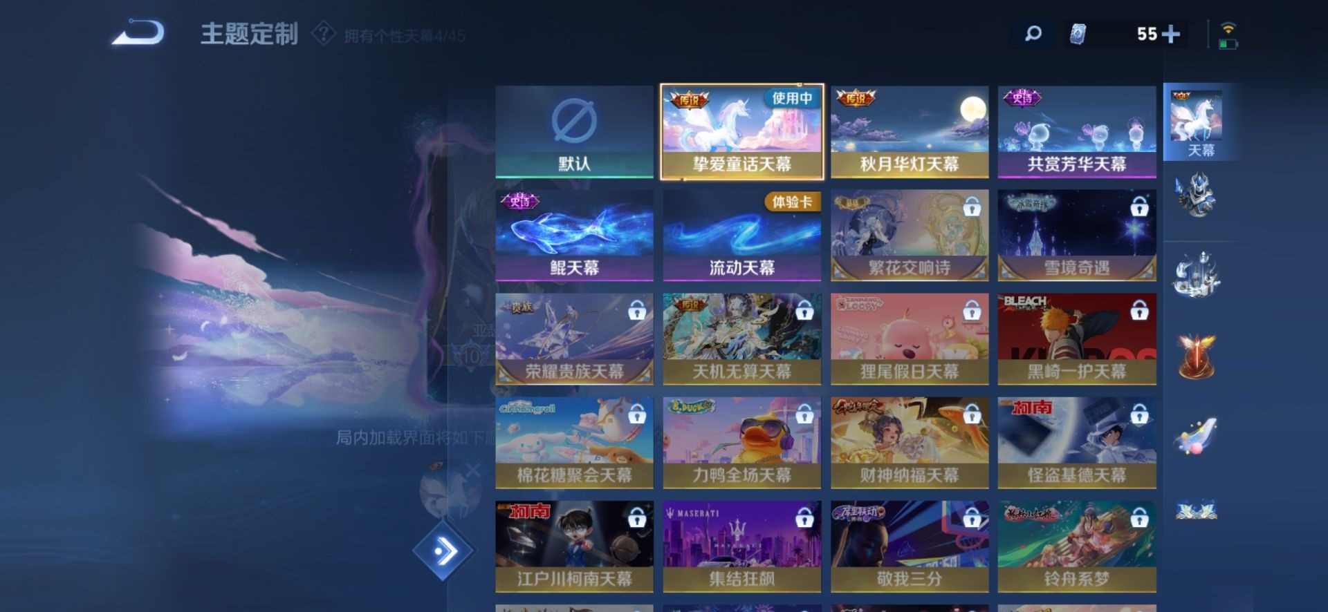 大乔白蛇,大乔猫狗日记,高渐离天秀·音浪,刘邦德古拉伯爵,夏侯惇乘风破浪,阿轲暗夜猫娘,阿轲节奏热浪,哪吒雪上飞焰,沈梦溪匿光破解者,铠曙光守护者,刘备百相守梦,曹操幽灵船长,廉颇地狱岩魂,伽罗箭羽风息,小乔缤纷独角兽,小乔青蛇,孙尚香时之恋人,阿古朵顽趣,孙策猫狗日记,不知火舞魅语,海月浮梦罗烟,赵怀真鹤归松栖,鲁班七号电玩小子,项羽苍穹之光,吕布圣诞狂欢,露娜紫霞仙子,吕布末日机甲,庄周天秀·幻梦,镜玫瑰异探,镜真我赫兹,诸葛亮黄金分割率,刘禅电玩·爆裂旋风,司马懿暗渊魔法,刘禅天才门将,刘禅绅士熊喵,宫本武藏鬼剑武藏,杨玉环银翎春语,公孙离无限星赏官,兰陵王暗隐猎兽者,貂蝉圣诞恋歌,貂蝉唤灵魅影,花木兰水晶猎龙者,夏洛特永昼,李白千年之狐,蒙犽龙鼓争鸣,安琪拉心灵骇客,安琪拉时之奇旅,艾琳奇遇舞章,杨戬天秀·启明,西施诗语江南,白起星夜王子,亚瑟心灵战警,张良千筹问战,嬴政摇滚巨星,嬴政暗夜贵公子,莱西奥末日机甲,程咬金功夫厨神,百里玄策热力回旋,百里玄策原初追逐者,雅典娜冰冠公主,雅典娜黎明之约,韩信白龙吟,李元芳匿光侦查者,百里守约真我赫兹,李元芳逐浪之夏,百里守约特工魅影,墨子龙骑士,墨子金属风暴,蔡文姬舞动绿茵,瑶遇见神鹿,蔡文姬电玩·兔顽号,澜赏金猎手,弈星滕王阁序,娜可露露晚萤,王昭君偶像歌手,嫦娥拒霜思,钟馗乐园奇幻夜,橘右京修罗,关羽百相守梦