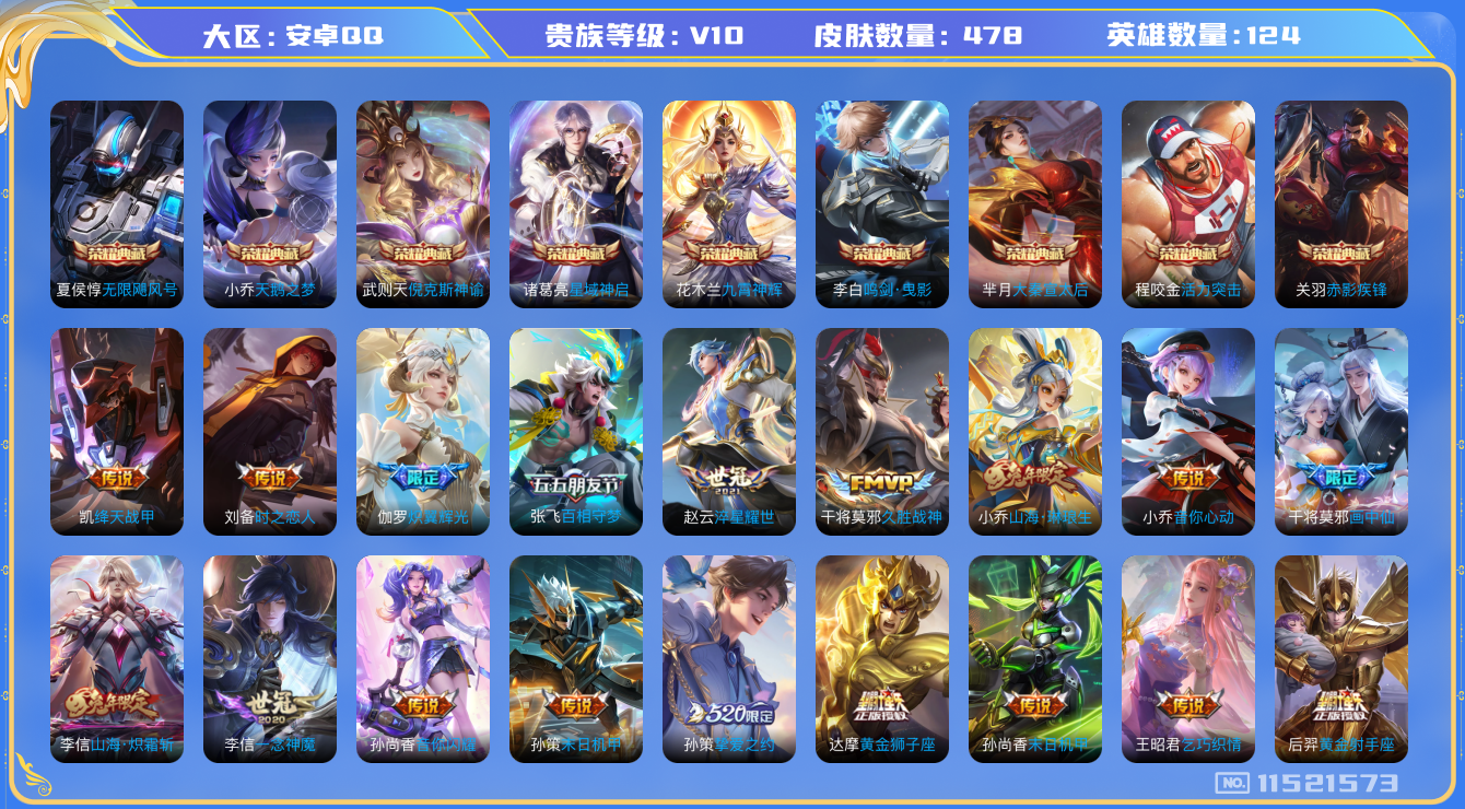 [11521573]V10 9典藏 80传说 124英雄 478皮肤 典藏英雄武则天 可修改实名 优质装备:天鹅之梦(小乔典藏),倪克斯神谕(宇宙婆娘),无限飓风号(高达),活力突击,大秦宣太后,鸣剑·曳影,星域神启(倪克斯贼亮),九霄神辉(木兰典藏),赤影疾锋,黄金狮子座,黄金射手座,冠军飞将,云鹰飞将(小将军),绛天战甲(鸡嘴战神),黄金白羊座,猫影幻舞,久胜战神,炽阳神光,一念神魔,云霓雀翎,末日机甲-孙尚香(绿蚂蚱),地狱火,仲夏夜之梦(大飞蛾),音你心动-小乔,零号·赤焰,海洋之心,地狱之眼,飞鸢探春,音你心动-周瑜,胖达荣荣,李逍遥,乞巧织情,时之恋人-刘备(电焊工),游龙清影(小青龙),淬星耀世,超时空战士-狄仁杰,遇见胡旋,末日机甲-孙策,花朝如约(花篮子),挚爱之约,无双飞将,音你闪耀(rap皮),碎云,天秀幻梦,神器·狴犴令,山海·炽霜斩(李信年限),山海·琳琅生(小乔年限),山海·苍雷引(电光曜子),炽翼辉光(娃娃菜牛角包),燃星之曲,画中仙,浮生妄,记忆之芯(机甲兔),百相守梦(张飞),追逃游戏(亚瑟),追逃游戏(安琪拉),电玩·雷克斯,鹤羽星尊,灼幽烈阳,妄想实况,妄想奇谈,鹤归松栖(云缨),惊梅引,艾琳觅芳踪 珍宝阁皮:蔷薇恋人,女武神 限定皮:至尊宝,白虎志(电光耗子),凤求凰(白切鸡),凤凰于飞,太华(伽罗年限),武陵仙君(小桃花),异界灵契(白毛香),傲雪梅枪,寅虎·展翼(孙膑年限),前尘镜,星穹之声,绯月行,时之彼端,白鹤梁神女,魔法小厨娘,白晶晶,时雨天司(水龙头),神威(电光马子),飞衡(韩信年限),玄嵩(庄周年限),山海·碧波行(瑶年限),无限倾心-项羽,瑞麟志(木兰年限),遇见飞天,高山流水,诗剑行,无限倾心-虞姬,齐天大圣,怒海麟威,降魔,五谷丰年,青龙志(铠年限),冰锋战神,幽恒(沐浴露),武圣,天狼运算者,游园惊梦,梁祝,御风骁将(吕布年限),天狼狩猎者,龙胆,逐梦之星,烈魂,岱宗(典韦年限),天狼溯光者,虎魄,天狼征服者,奔雷神使(牛魔年限),祈雪灵祝(雪兔子),天狼绘梦者,李小龙,逐梦之影,逐梦之光,玄武志(苏烈年限),朱雀志(守约年限),永曜之星,辉光之辰,如梦令-嫦娥,如梦令-后羿,霸王别姬-项羽,霸王别姬-虞姬,奇迹圣诞,默契交锋-兰陵王,默契交锋-花木兰,真爱至上,纯白花嫁,孙行者,猪悟能,一生所爱,大圣娶亲,引擎之心,