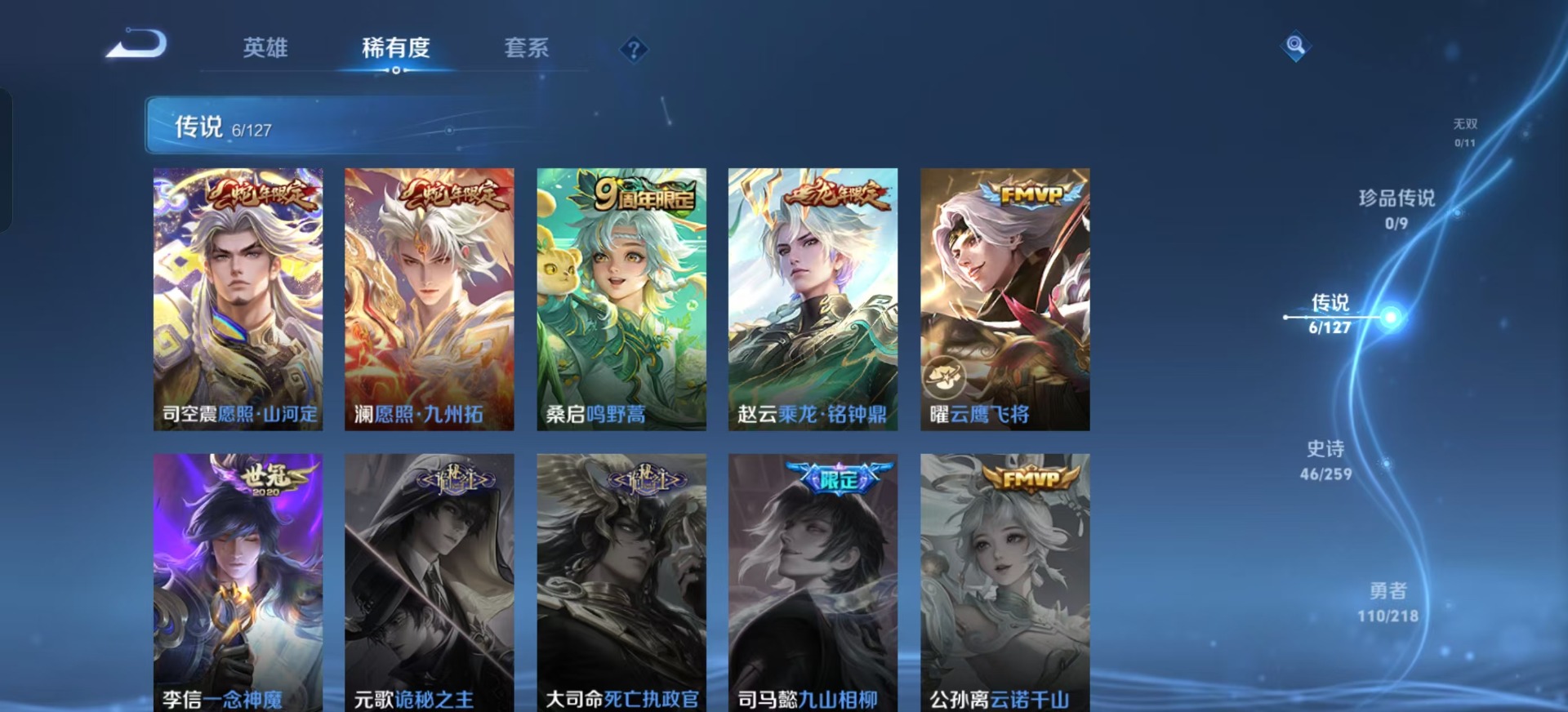 - [12233330]V8 1典藏 1珍品传说 10传说 124英雄 294皮肤 可修改实名 优质装备:弑枪猎影(韩信典藏),怪盗基德,一念神魔,地狱之眼,超时空战士-狄仁杰,音你闪耀(rap皮),山海·炽霜斩(李信年限),澜逐花归海,琥珀纪元铠 珍宝阁皮:万物之道,玩趣恶龙 限定皮:鸣野蒿,至尊宝,齐天大圣,五谷丰年,辉光之辰,大圣娶亲,神奇女侠,唐三藏,时之奇旅-妲己 史诗皮:鸭鸭历险记-刘禅,飞车小橘子,谪仙醉月,龙之律动,茶境仙,琥珀纪元伽罗,决胜骁骑,蔬乡物语(鲁班七号),百相守梦-百里守约,紫霞仙子,黄金分割率,特工魅影,千年之狐,江河有灵,魅语,百解令(蒙犽),高渐离燃音魔法,白蛇,晚萤,电玩·爆裂旋风,暗夜猫娘,龙骑士(小龙虾),末日机甲-吕布,猫狗日记-孙策,猫狗日记-大乔,乱世虎臣,修罗,女仆咖啡,摇滚巨星,水果甜心,天才门将,心灵骇客,功夫厨神,德古拉伯爵,暗隐猎兽者,幽灵船长,鬼剑武藏,心灵战警,舞动绿茵,地狱岩魂,纤云弄巧,拒霜思,乘风破浪,逐浪之夏,水晶猎龙者,曙光守护者,金属风暴,圣诞狂欢,鹰眼统帅,魅力维加斯,赏金猎手,无心,未来纪元-赵云