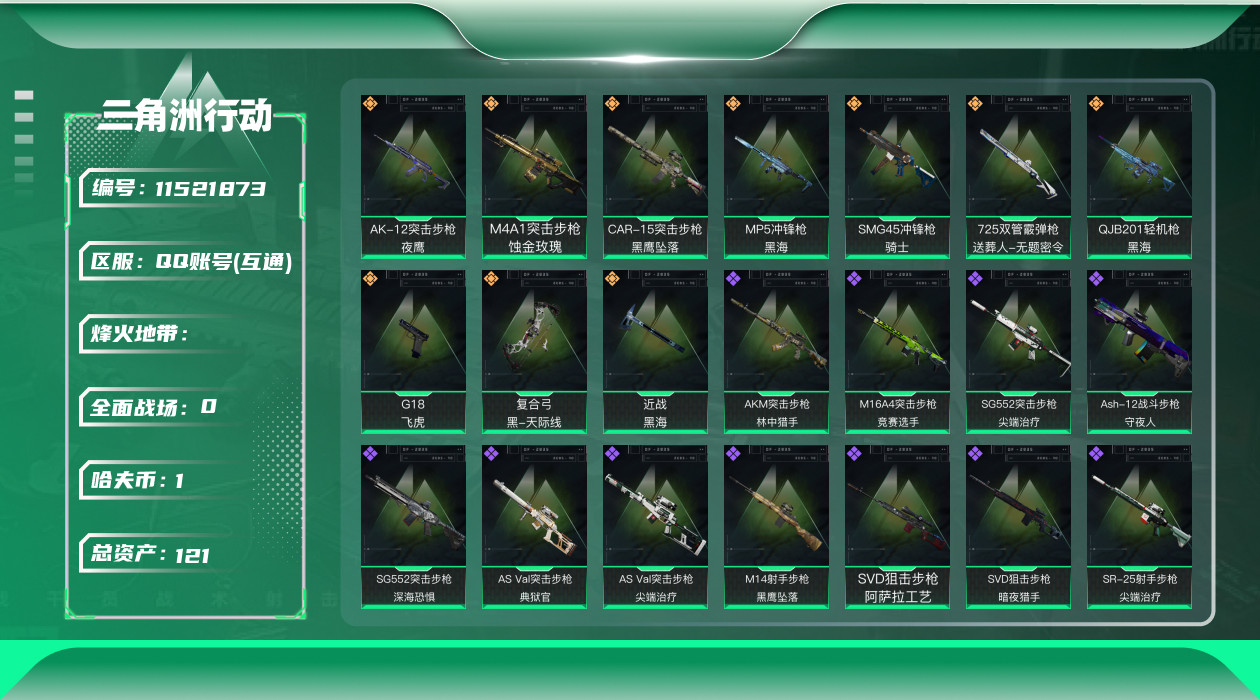 [11521873]可二次 可修改实名 实名:可修改 高级安全箱(9.17到期) 总资产:121 哈夫币:1.299 传说武器皮肤:近战-黑海,AK-12突击步枪-夜鹰,SMG45冲锋枪-骑士,QJB201轻机枪-黑海,MP5冲锋枪-黑海,复合弓-黑-天际线,725双管霰弹枪-送葬人-无题密令,G18-飞虎,M4A1突击步枪-蚀金玫瑰,CAR-15突击步枪-黑鹰坠落 史诗武器皮肤:M700狙击步枪-蝮蛇,SR-25射手步枪-尖端治疗,AS Val突击步枪-尖端治疗,M700狙击步枪-守夜人,SG552突击步枪-尖端治疗,Ash-12战斗步枪-守夜人,SG552突击步枪-深海恐惧,AKM突击步枪-林中猎手,SVD狙击步枪-暗夜猎手,M16A4突击步枪-竞赛选手,SV-98狙击步枪-林中猎手,PSG-1射手步枪-无垢,AS Val突击步枪-典狱官,沙漠之鹰-曙光,SVD狙击步枪-阿萨拉工艺,M14射手步枪-黑鹰坠落,M700狙击步枪-竞技风 干员外观:红狼-蚀金玫瑰