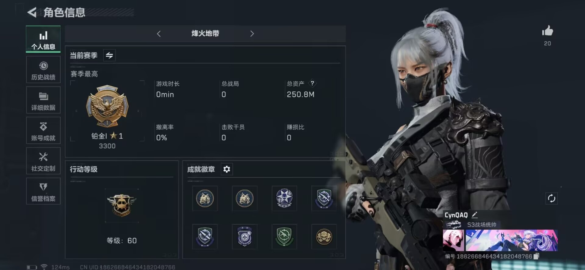 - [11490526]总资产:150.8M 10传说枪械 哈夫币:21.372K 高级安全箱(9.17到期) 可二次 可修改实名 烽火地带段位:黄金 全面战场段位:无段位 传说武器皮肤:UZI冲锋枪-特斯拉线圈,M16A4突击步枪-狩猎时刻,AK-12突击步枪-特斯拉线圈,SR-3M紧凑突击步枪-特斯拉线圈,勇士冲锋枪-能天使-午夜邮差,Vector冲锋枪-狩猎时刻,G3战斗步枪-狩猎时刻,725双管霰弹枪-送葬人-无题密令,M4A1突击步枪-阿米娅,CAR-15突击步枪-阿米娅 史诗武器皮肤:勇士冲锋枪-深海恐惧,SG552突击步枪-深海恐惧,PKM通用机枪-荒野求生,M250通用机枪-囚徒,腾龙突击步枪-无垢,MP7冲锋枪-无垢,SR-3M紧凑突击步枪-荒野求生,QBZ95-1突击步枪-曙光,S12K霰弹枪-曙光