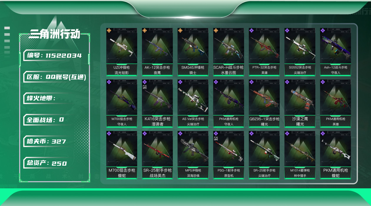 [11522034]可二次 可修改实名 实名:可修改 总资产:250.8 哈夫币:327.760 传说武器皮肤:SCAR-H战斗步枪-水墨云图,AK-12突击步枪-夜鹰,SMG45冲锋枪-骑士,UZI冲锋枪-流光铂影 史诗武器皮肤:Vector冲锋枪-潜袭者,K416突击步枪-潜袭者,PSG-1射手步枪-原型机(典藏),AUG突击步枪-蝮蛇,M700狙击步枪-蝮蛇,PKM通用机枪-蝮蛇,SR-25射手步枪-战场英杰,G3战斗步枪-战场英杰,SR-25射手步枪-尖端治疗,AS Val突击步枪-尖端治疗,M700狙击步枪-守夜人,SG552突击步枪-尖端治疗,Ash-12战斗步枪-守夜人,MP5冲锋枪-深海恐惧,AKM突击步枪-林中猎手,PKM通用机枪-守夜人,P90冲锋枪-暗影猎手,M1014霰弹枪-林中猎手,PTR-32突击步枪-英雄,QBZ95-1突击步枪-曙光,沙漠之鹰-曙光,SVD狙击步枪-阿萨拉工艺,S12K霰弹枪-曙光,PKM通用机枪-英雄,M700狙击步枪-竞技风 干员外观:骇爪-水墨云图