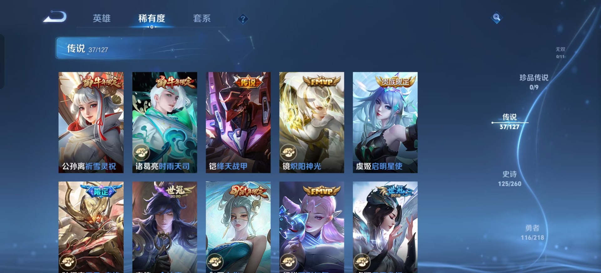 - [12062899]V7 1典藏 5传说 124英雄 162皮肤 可修改实名 优质装备:鸣剑·曳影,地狱火,超时空战士-狄仁杰,鹤羽星尊,玄雷天君 珍宝阁皮:蔷薇恋人 限定皮:五谷丰年,武圣,梁祝,李小龙,猪悟能 史诗皮:化蝶舞,龙之律动,百相守梦-周瑜,茶境仙,百相守梦-黄忠,电玩小子(小书包),黄金分割率,特工魅影,千年之狐,江河有灵,魅语,高渐离燃音魔法,冰冠公主,末日机甲-吕布,节奏热浪,水果甜心,绅士熊喵,天才门将,星夜王子,心灵骇客,功夫厨神,暗隐猎兽者,鬼剑武藏,缤纷独角兽,水晶猎龙者,曙光守护者,金属风暴,圣诞狂欢,圣诞恋歌,鹰眼统帅,暗夜贵公子,魅力维加斯,未来纪元-赵云