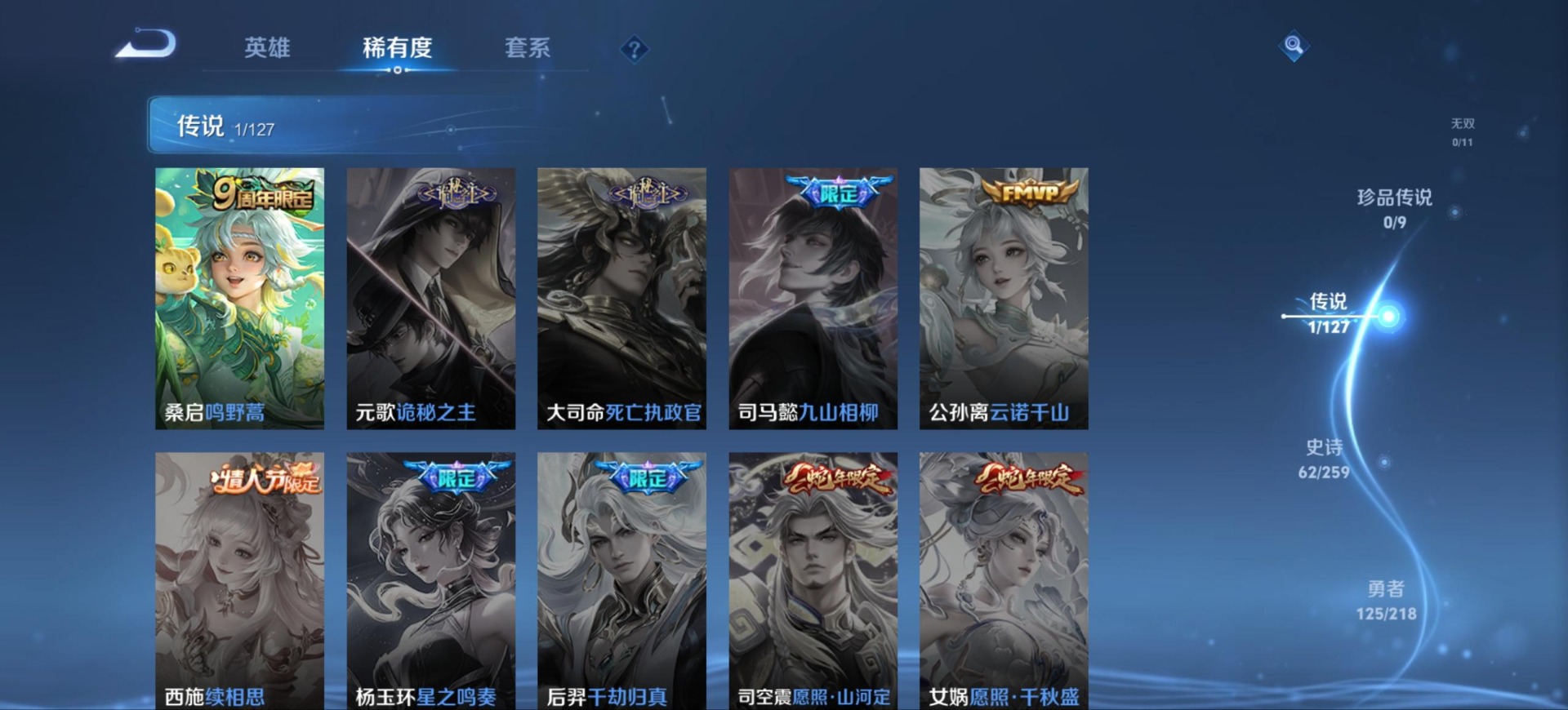 高渐离燃音魔法,夏侯惇乘风破浪,阿轲节奏热浪,铠曙光守护者,曹操幽灵船长,伽罗箭羽风息,廉颇地狱岩魂,小乔缤纷独角兽,孙策猫狗日记,吕布圣诞狂欢,诸葛亮黄金分割率,刘禅电玩·爆裂旋风,刘禅天才门将,刘禅绅士熊喵,宫本武藏鬼剑武藏,兰陵王暗隐猎兽者,貂蝉圣诞恋歌,花木兰水晶猎龙者,蒙犽百解令,杨戬天秀·启明,白起星夜王子,亚瑟心灵战警,嬴政摇滚巨星,程咬金功夫厨神,百里玄策原初追逐者,雅典娜冰冠公主,李元芳逐浪之夏,百里守约特工魅影,墨子金属风暴,王昭君偶像歌手,嫦娥拒霜思