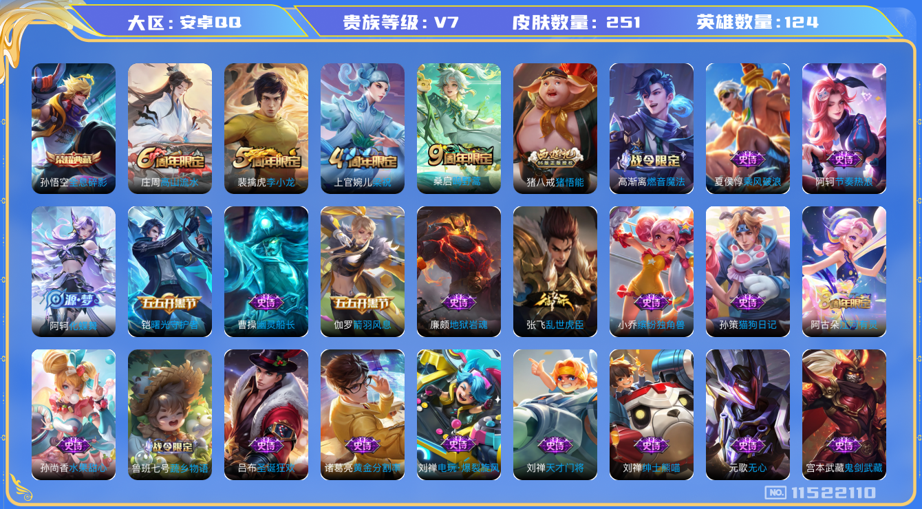 [11522110]V7 1典藏 1传说 124英雄 251皮肤 可修改实名 优质装备:全息碎影(猴子典藏) 珍宝阁皮:妄想食味,蔷薇恋人,玩趣恶龙 限定皮:鸣野蒿,高山流水,梁祝,李小龙,猪悟能 史诗皮:化蝶舞,龙之律动,蔬乡物语(鲁班七号),黄金分割率,特工魅影,电玩·爆裂旋风,江河有灵,百解令(蒙犽),高渐离燃音魔法,蒙恬荣光圣徽,偶像歌手,冰冠公主,猫狗日记-孙策,乱世虎臣,节奏热浪,女仆咖啡,摇滚巨星,水果甜心,绅士熊喵,天才门将,星夜王子,功夫厨神,暗隐猎兽者,幽灵船长,鬼剑武藏,心灵战警,天秀·启明,地狱岩魂,纤云弄巧,拒霜思,缤纷独角兽,乘风破浪,逐浪之夏,水晶猎龙者,曙光守护者,箭羽风息,金属风暴,原初追逐者,圣诞狂欢,圣诞恋歌,鹰眼统帅,魅力维加斯,无心,未来纪元-赵云