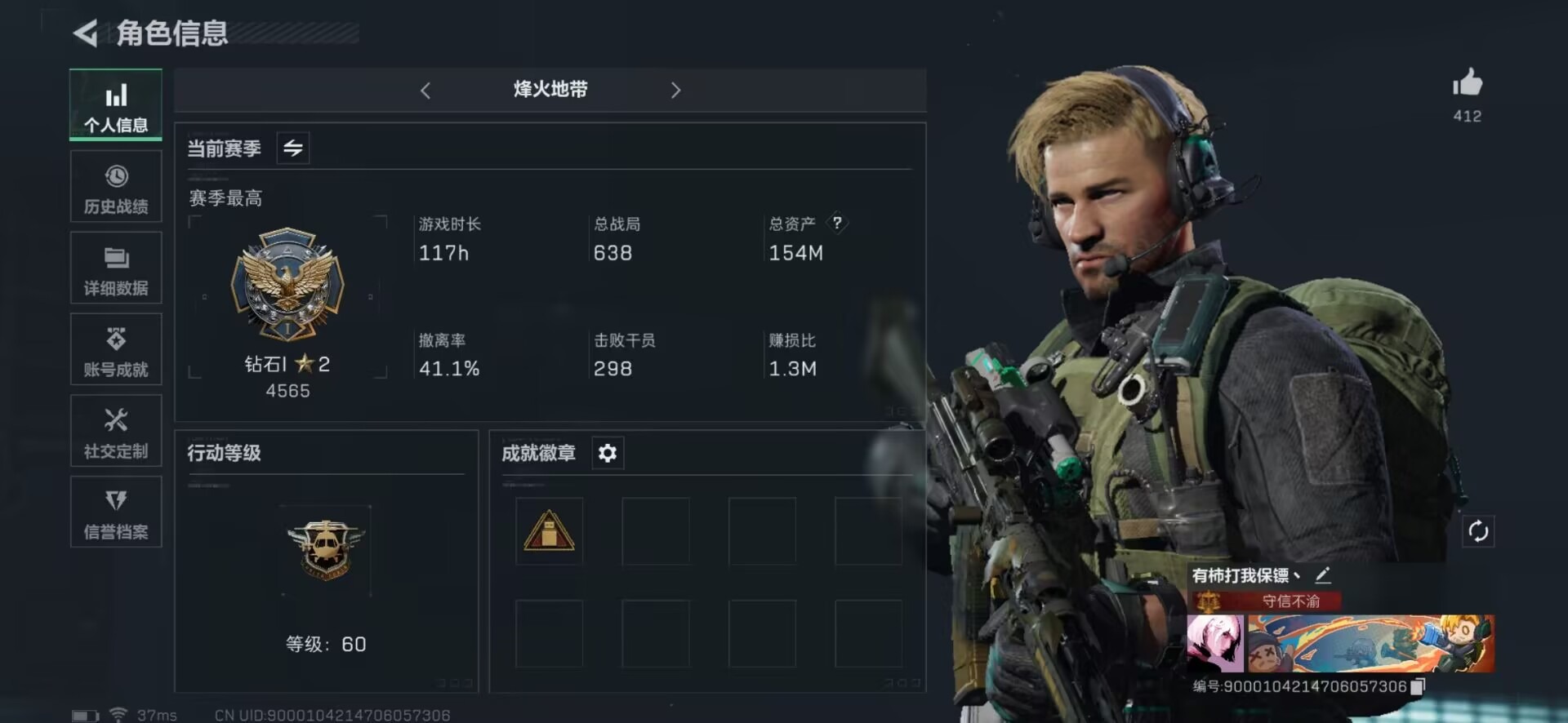 - [11625533]可二次 可修改实名 实名:可修改 烽火地带段位:铂金 全面战场段位:尉官 总资产:96.9 哈夫币:5.077 传说武器皮肤:SR-25射手步枪-水墨云图,复合弓-黑-天际线 史诗武器皮肤:PSG-1射手步枪-无垢,QSZ92G-风林火山 干员外观:红狼-蚀金玫瑰,露娜-黑·天际线