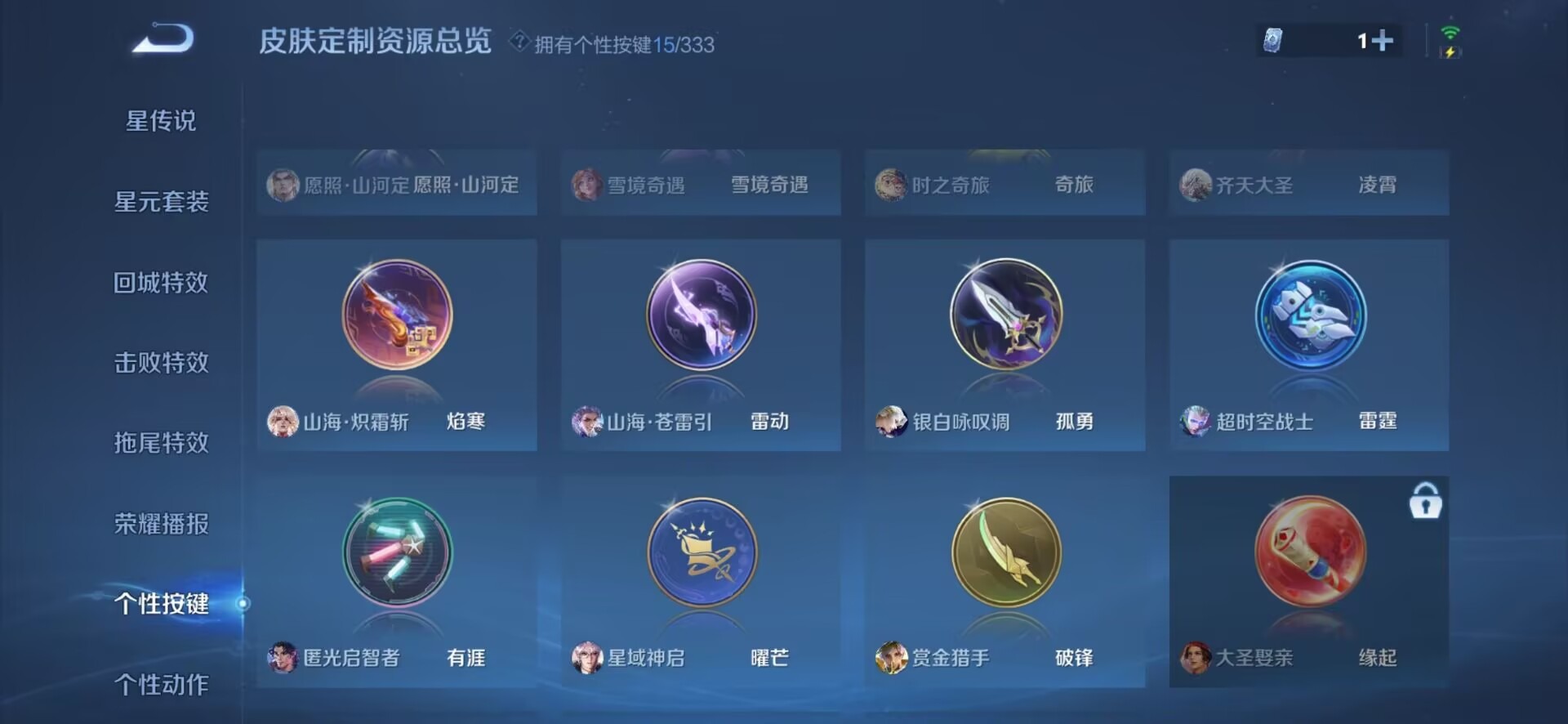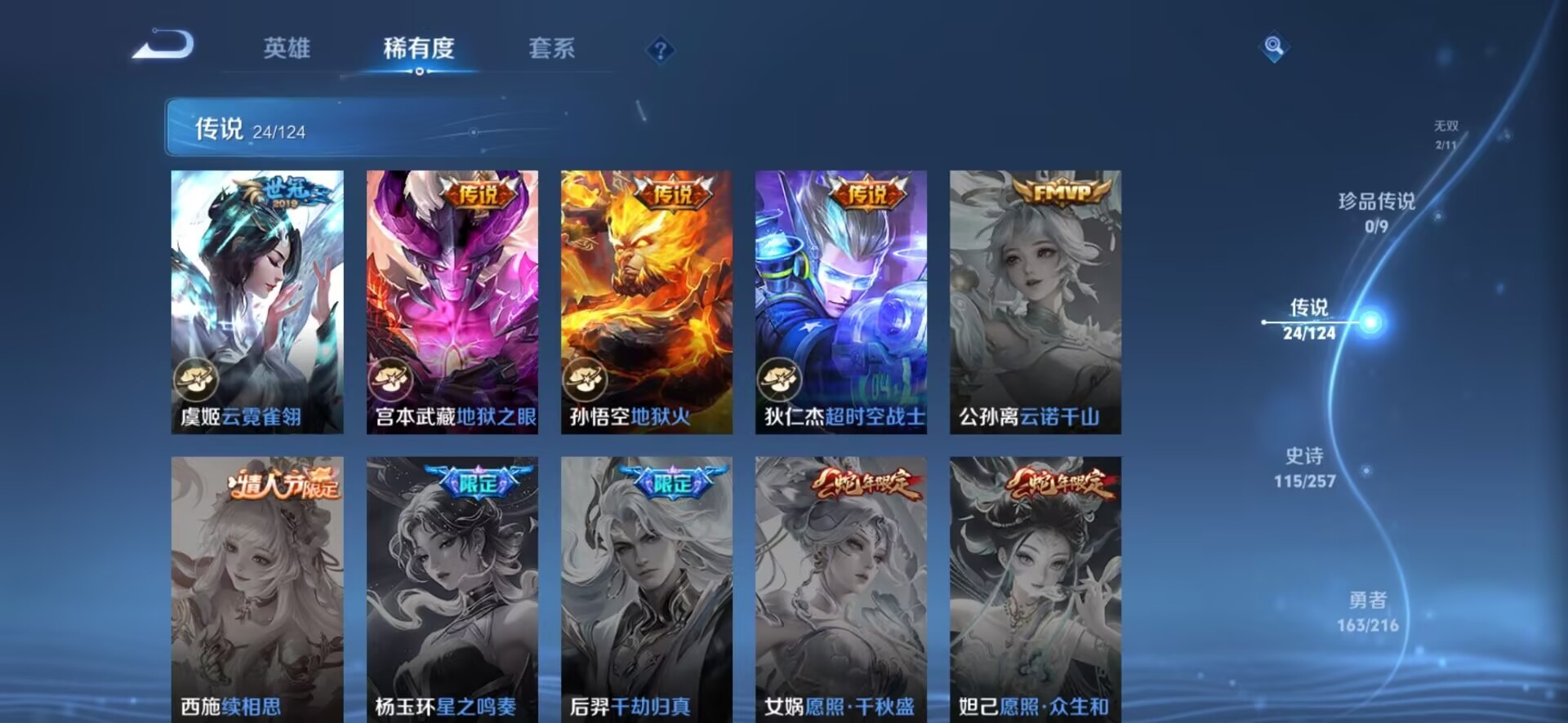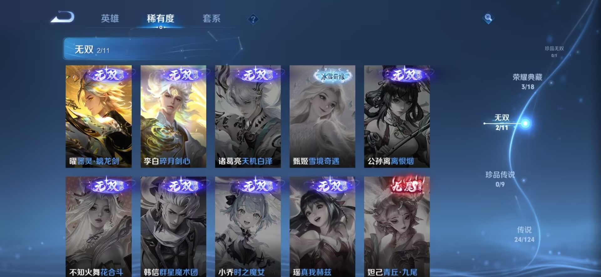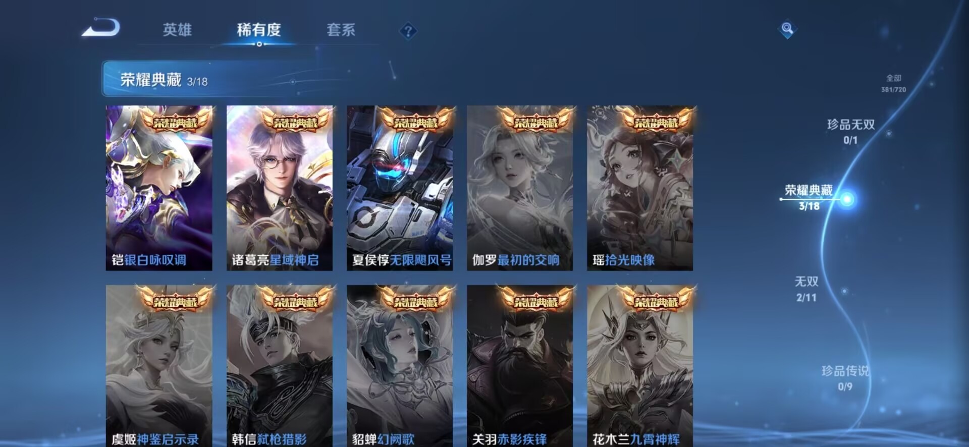 夏侯惇匿光决锋者,伽罗天狼溯光者,赵云百木心枪,孙膑天狼运算者,干将莫邪冰霜恋舞曲,孙尚香异界灵契,后羿如梦令,诸葛亮时雨天司,公孙离玉兔公主,司空震愿照·山河定,鲁班大师匿光启智者,裴擒虎李小龙,上官婉儿神器·万象笔,上官婉儿天狼绘梦者,马可波罗逐梦之星,马可波罗山海·玄木吟,桑启鸣野蒿,孙悟空孙行者,孙悟空至尊宝,韩信逐梦之影,百里守约朱雀志,墨子降魔,瑶山海·碧波行