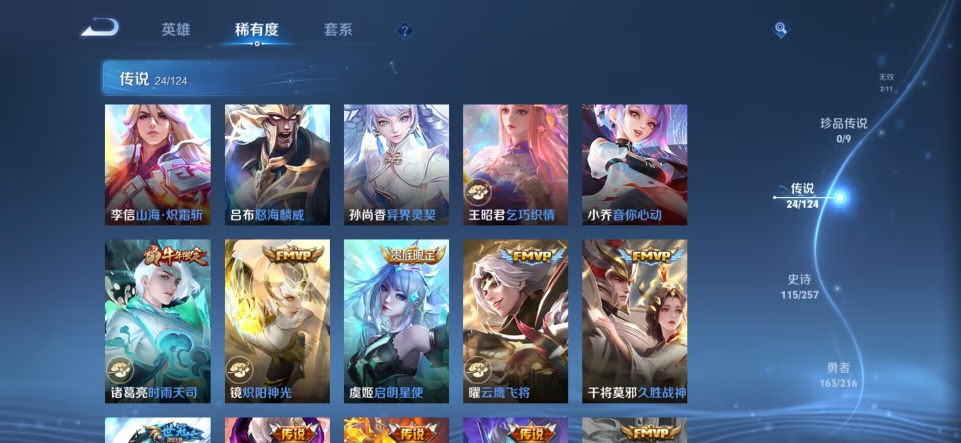 - PX_2101869-贵族7/皮肤160/传说4/史诗40/英雄123/暃朽木白哉/女武神/冠军飞将/碎云/桑启鸣野蒿/裴擒虎祥瑞亨通/姜子牙天穹之誓/狄仁杰阴阳师/赵云皇家上将/钟无艳超时空战士/芈月幻夜卜梦/元歌无心/甄姬落雪兰心/狄仁杰魔术师/沙漠行僧/项羽海滩派对/演武夺筹/傲雪梅枪/王昭君午后时光/金庭之子/后羿圣弓游侠/云中旅人/驱傩正仪/干将莫邪真爱魔法/鬼谷子五谷丰年/黄忠火炮绅士