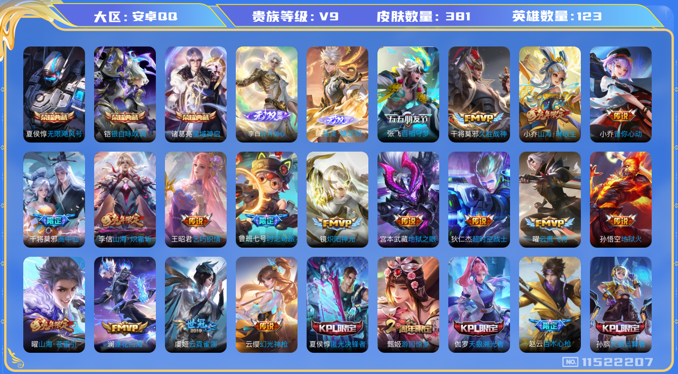 [11522207]V9 3典藏 2无双 24传说 123英雄 381皮肤 可修改实名 荣耀水晶:银白咏叹调(倪克斯侍卫),无限飓风号(高达),星域神启(倪克斯贼亮) 无双皮:器灵·螭龙剑,碎月剑心(李白无双) 传说皮:幻光神枪,山海·炽霜斩(李信年限),山海·琳琅生(小乔年限),地狱火,地狱之眼,云霓雀翎,久胜战神,云鹰飞将(小将军),炽阳神光,音你心动-小乔,乞巧织情,超时空战士-狄仁杰,山海·苍雷引(电光曜子),画中仙,百相守梦(张飞),鲁班七号-时之奇旅,澜逐花归海 珍宝阁皮:妄想食味,优雅恋人,蔷薇恋人 限定皮:愿照·山河定(司空震年限),鸣野蒿,至尊宝,异界灵契(白毛香),时雨天司(水龙头),山海·碧波行(瑶年限),高山流水,齐天大圣,匿光决锋者,怒海麟威,降魔,五谷丰年,天狼运算者,游园惊梦,逐梦之星,天狼溯光者,天狼绘梦者,李小龙,逐梦之影,朱雀志(守约年限),如梦令-后羿,孙行者,冰霜恋舞曲,百木心枪,玉兔公主,匿光启智者,神器·万象笔,山海·玄木吟(马可年限) 史诗皮:器灵·浮梦炉,灵蛊蚀心,龙之律动,紫霞仙子,苍穹之光,电玩小子(小书包),白龙吟,黄金分割率,特工魅影,千年之狐,永昼,真我赫兹(百里守约),江河有灵,高渐离燃音魔法,雪夜绮愿(周瑜),百解令(蒙犽),蒙恬荣光圣徽,冰冠公主,偶像歌手,晚萤,无限星赏官,电玩·爆裂旋风,百相守梦(刘备),百相守梦(关羽),暗夜猫娘,龙骑士(小龙虾),末日机甲-吕布,猫狗日记-孙策,猫狗日记-大乔,乱世虎臣,节奏热浪,修罗,女仆咖啡,摇滚巨星,水果甜心,绅士熊喵,天才门将,星夜王子,心灵骇客,功夫厨神,德古拉伯爵,暗隐猎兽者,幽灵船长,鬼剑武藏,心灵战警,舞动绿茵,地狱岩魂,纤云弄巧,繁星吟游(呼啦呼啦),拒霜思,缤纷独角兽,乘风破浪,逐浪之夏,水晶猎龙者,曙光守护者,箭羽风息,金属风暴,原初追逐者,圣诞狂欢,圣诞恋歌,鹰眼统帅,王者之锤,暗夜贵公子,魅力维加斯,黎明之约,雪上飞焰,赏金猎手,无心,未来纪元-赵云