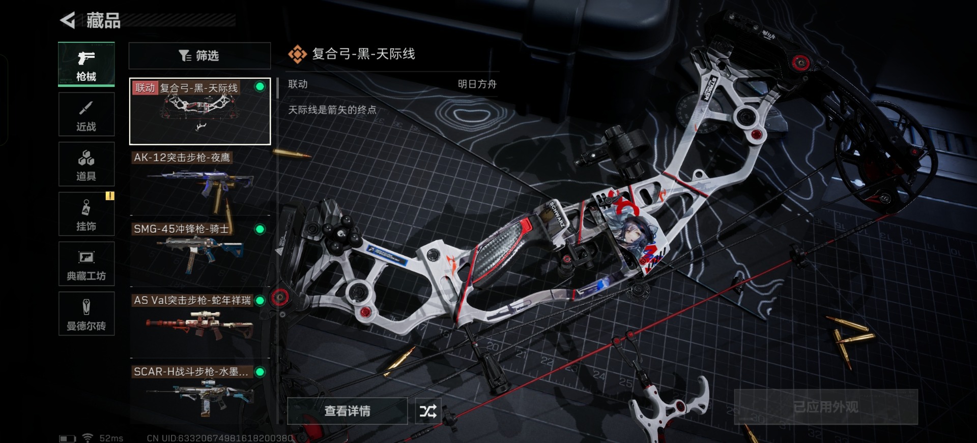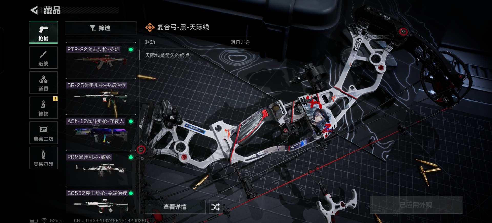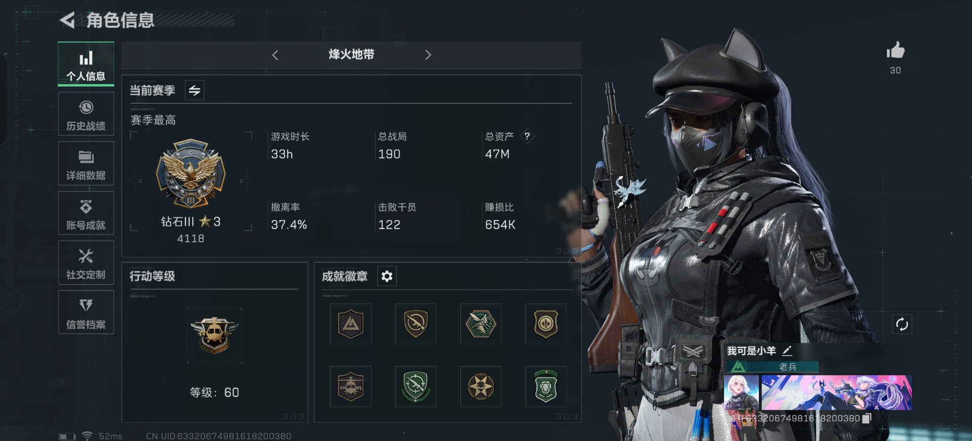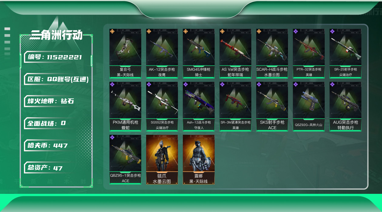[11522221]可二次 可修改实名 实名:可修改 烽火地带段位:钻石 全面战场段位:上等兵 进阶安全箱(2×2)9.15号到期 总资产:47 哈夫币:447.737 传说武器皮肤:AS Val突击步枪-蛇年祥瑞,SCAR-H战斗步枪-水墨云图,AK-12突击步枪-夜鹰,SMG45冲锋枪-骑士,复合弓-黑-天际线 史诗武器皮肤:SR-3M紧凑突击步枪-英雄,QBZ95-1突击步枪-ACE,AUG突击步枪-特勤执行,SKS射手步枪-ACE,PKM通用机枪-蝮蛇,SR-25射手步枪-尖端治疗,SG552突击步枪-尖端治疗,Ash-12战斗步枪-守夜人,PTR-32突击步枪-英雄,QSZ92G-风林火山 干员外观:骇爪-水墨云图,露娜-黑·天际线