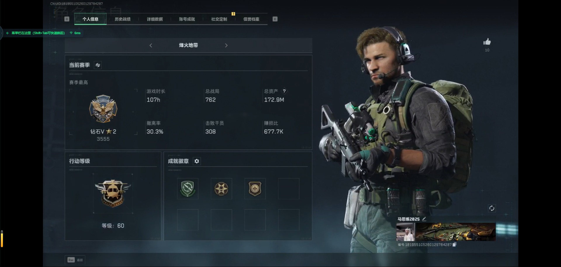 - [11682583]总资产:83.4M 5干员外观 1近战传说 13传说枪械 哈夫币:9.363K 可二次 可修改实名 优质装备:近战-影锋 烽火地带段位:铂金 全面战场段位:上等兵 传说武器皮肤:AS Val突击步枪-蛇年祥瑞,SR-25射手步枪-水墨云图,SCAR-H战斗步枪-水墨云图,M1014霰弹枪-影锋,SCAR-H战斗步枪-铁艺苍穹,AK-12突击步枪-夜鹰,G18-飞虎,SMG45冲锋枪-骑士,勇士冲锋枪-能天使-午夜邮差,M4A1突击步枪-蚀金玫瑰,QBZ95-1突击步枪-破军,Vector冲锋枪-能天使-午夜邮差 史诗武器皮肤:SR-3M紧凑突击步枪-英雄,QBZ95-1突击步枪-ACE,M4A1突击步枪-特勤执行,M700狙击步枪-蝮蛇,PKM通用机枪-蝮蛇,Ash-12战斗步枪-守夜人,SG552突击步枪-尖端治疗,SR-25射手步枪-尖端治疗,SG552突击步枪-深海恐惧,AKM突击步枪-林中猎手,M1014霰弹枪-林中猎手,SV-98狙击步枪-林中猎手,M250通用机枪-囚徒,SV-98狙击步枪-囚徒,M700狙击步枪-阿萨拉工艺,UZI冲锋枪-危险实验,M249轻机枪-维京,沙漠之鹰-曙光,Vector冲锋枪-阿萨拉文明,S12K霰弹枪-曙光,PKM通用机枪-英雄,M700狙击步枪-竞技风,QSZ92G-风林火山,93R-博士,ASh-12战斗步枪-刀锋 干员外观:威龙-铁面判官,红狼-蚀金玫瑰,骇爪-水墨云图,无名-夜鹰,威龙-飞虎