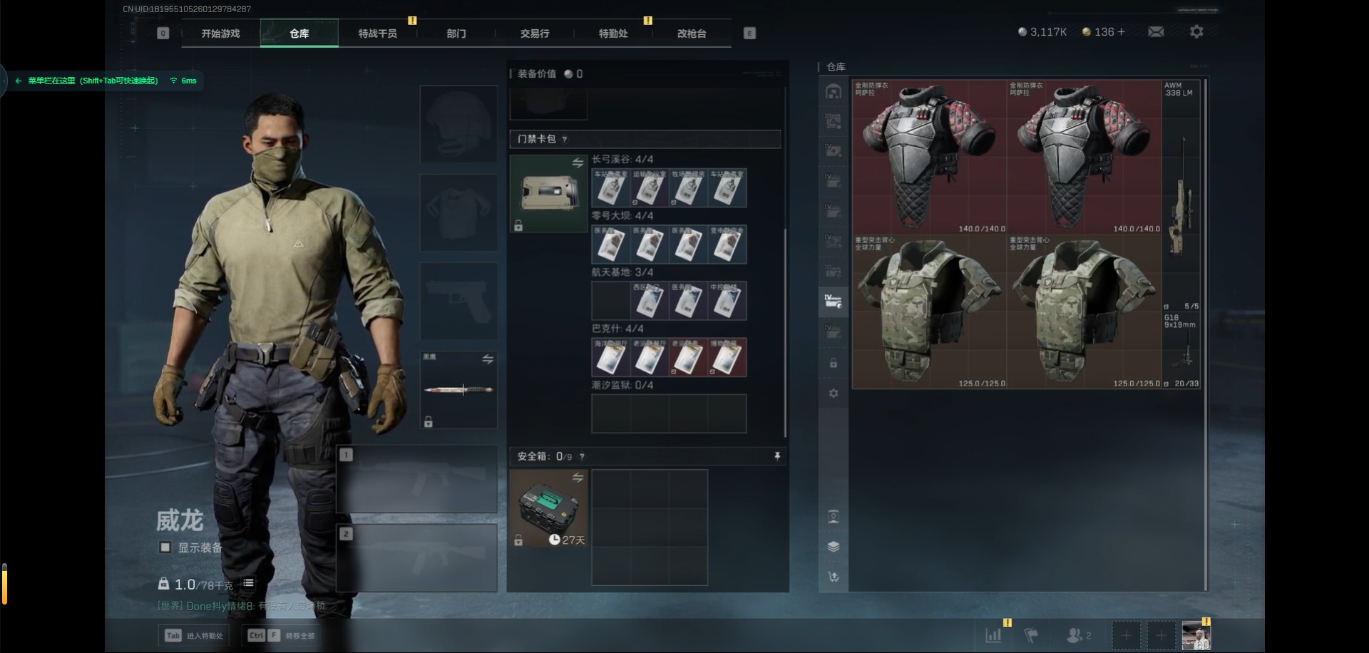 - [11819602]总资产:174.5M 10传说枪械 哈夫币:110K 高级安全箱(2×3)9.15号到期 可二次 可修改实名 烽火地带段位:白银 全面战场段位:列兵 传说武器皮肤:M4A1突击步枪-阿米娅,CAR-15突击步枪-阿米娅,复合弓-黑-天际线,QCQ171冲锋枪-北极星,AK-12突击步枪-特斯拉线圈,SR-3M紧凑突击步枪-特斯拉线圈,UZI冲锋枪-特斯拉线圈,勇士冲锋枪-能天使-午夜邮差,725双管霰弹枪-送葬人-无题密令,K437突击步枪-北极星 史诗武器皮肤:M700狙击步枪-蝮蛇,PKM通用机枪-蝮蛇,SR-3M紧凑突击步枪-荒野求生,SV-98狙击步枪-林中猎手,SVD狙击步枪-荒野求生,SV-98狙击步枪-囚徒,SCAR-H战斗步枪-囚徒,腾龙突击步枪-无垢,MP7冲锋枪-无垢,PSG-1射手步枪-无垢