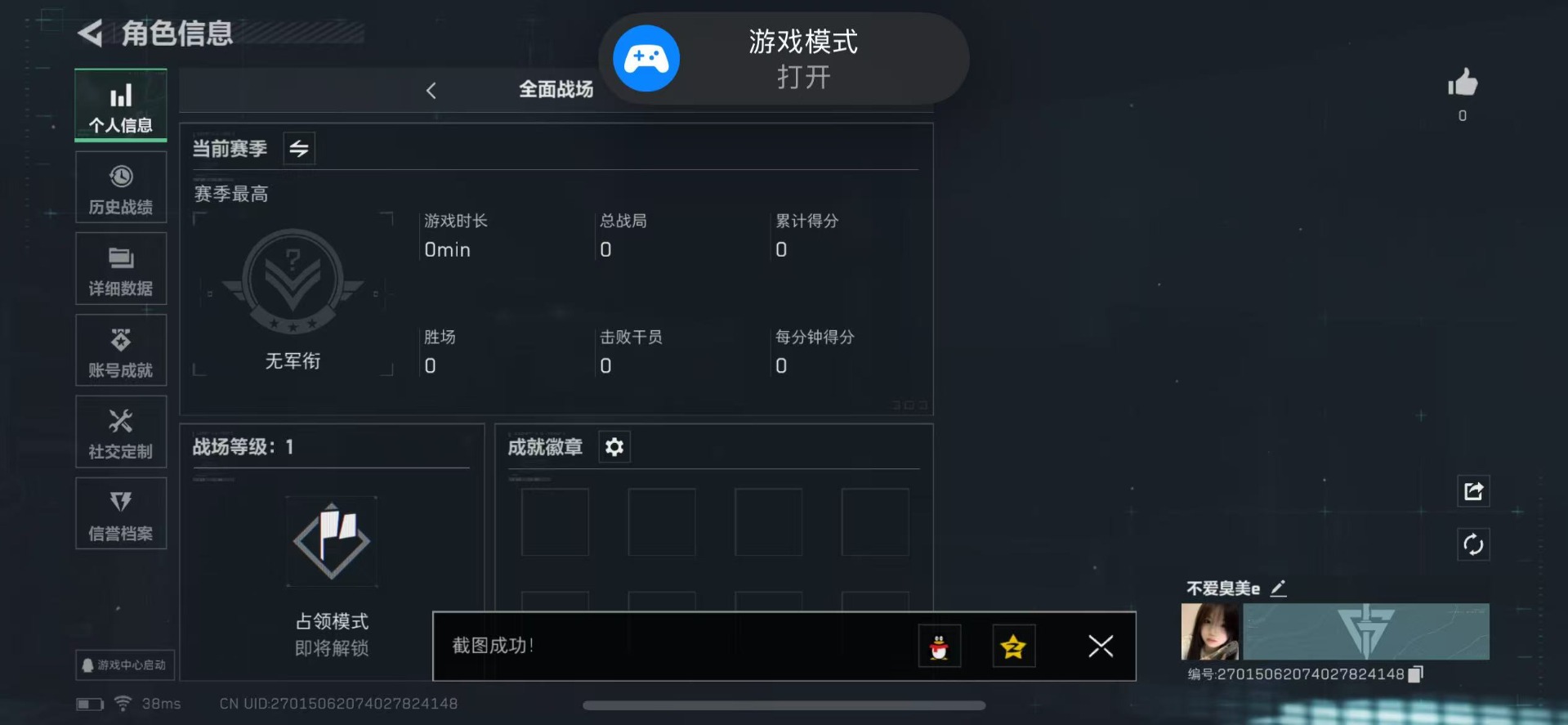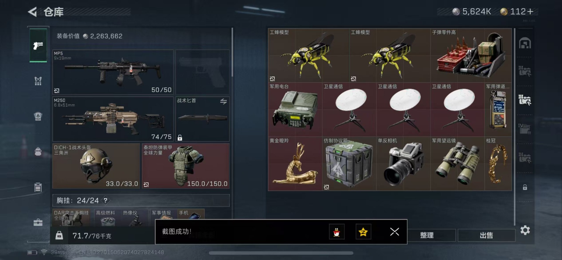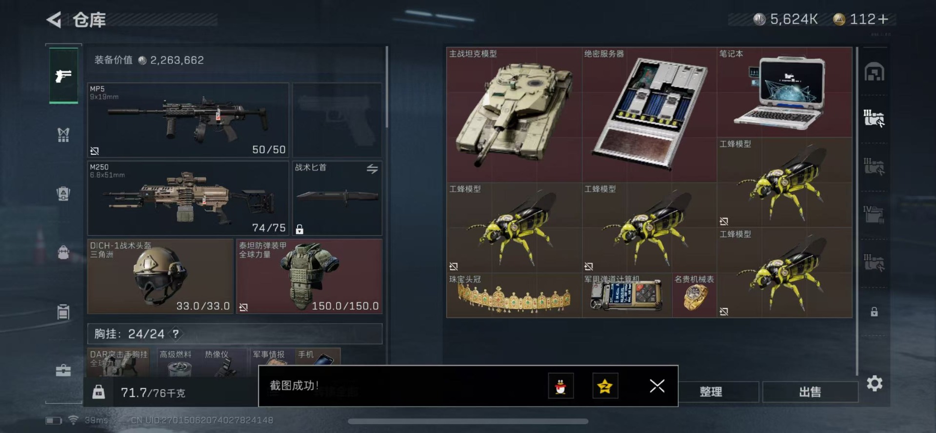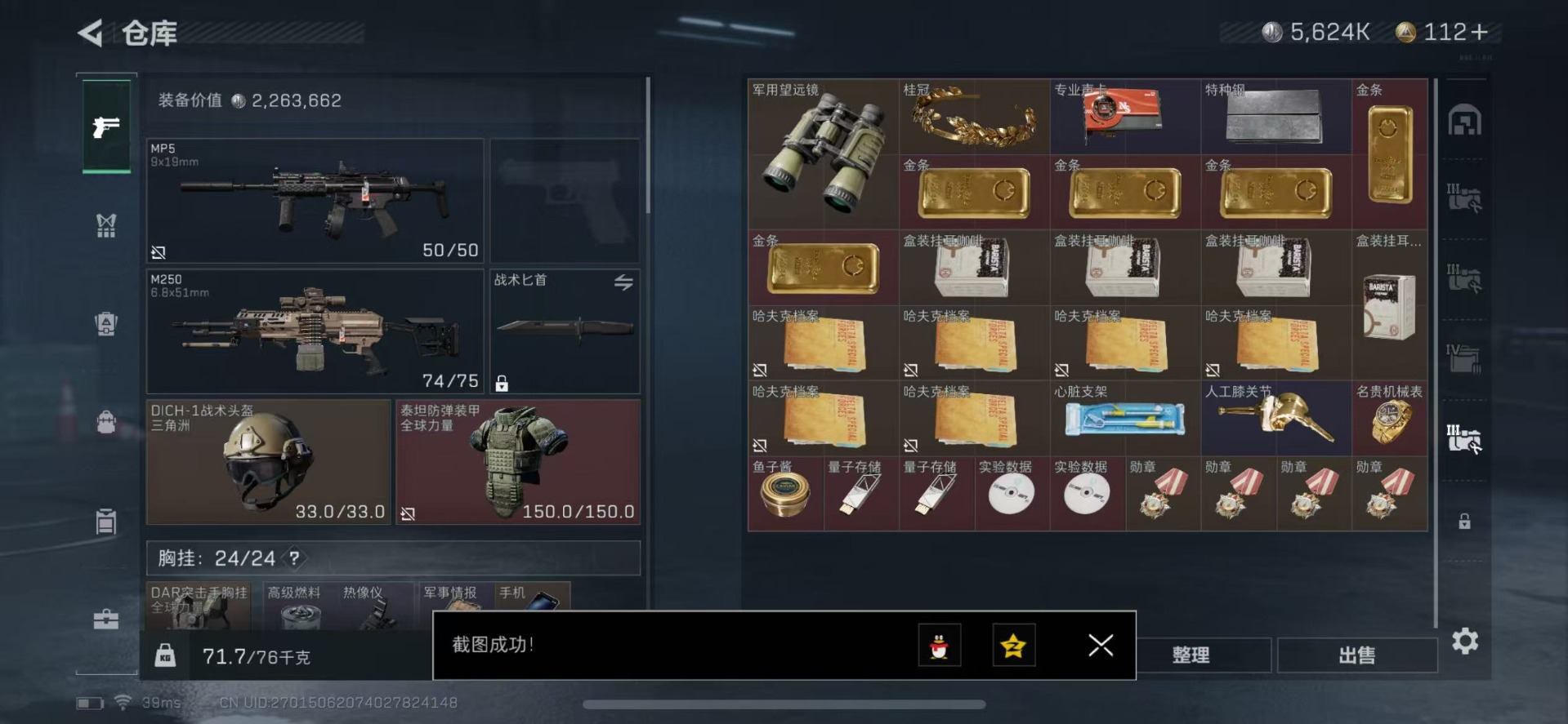 - [12060319]总资产:101.2M 哈夫币:36.569K 可二次 可修改实名 安全保护中 烽火地带段位:铂金 全面战场段位:无段位