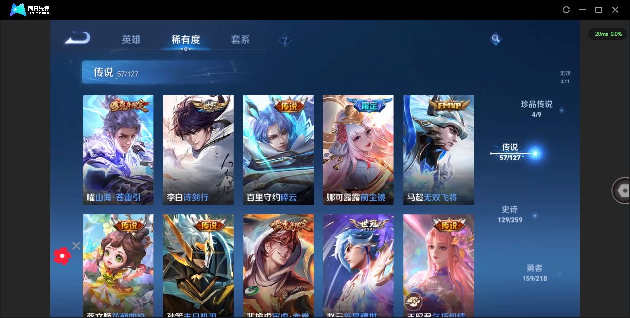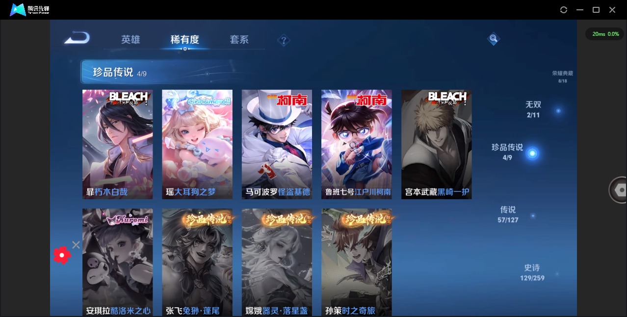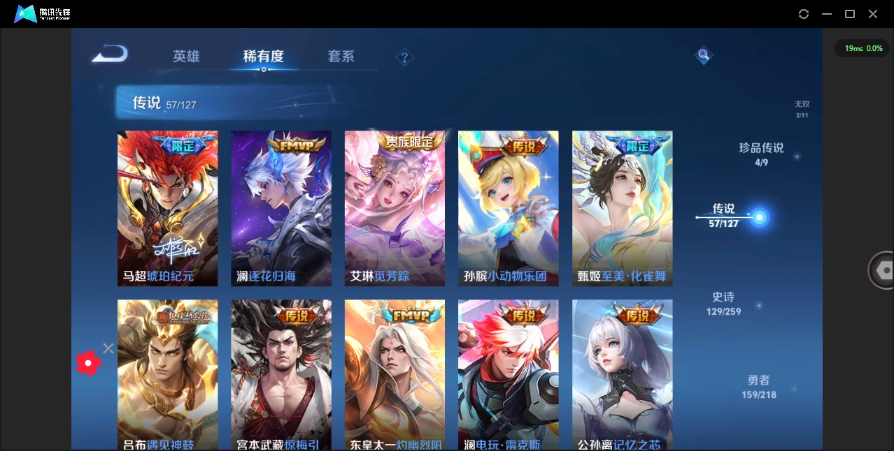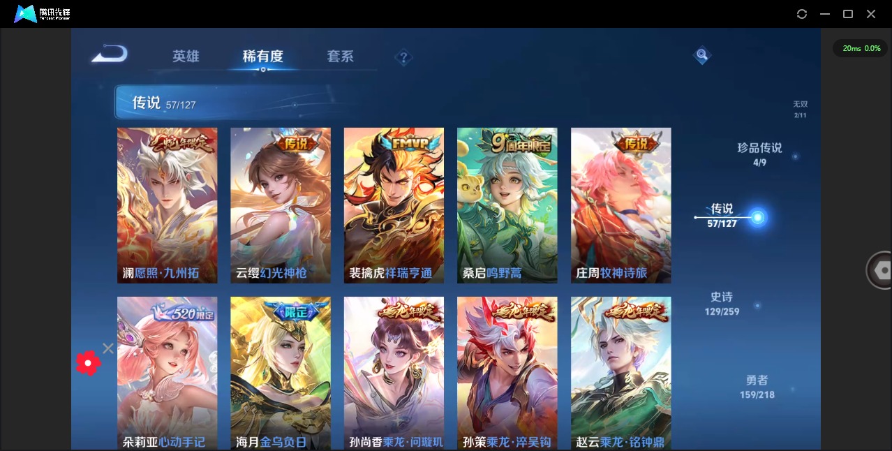 - PX_2108057-Q/永恒钻石/141皮肤/122英雄/0典藏/0珍品无双/0无双/3珍品传说/5传说/37史诗/7稀有英雄 【3 珍品传说】怪盗基德 马可波罗,时之奇旅 孙策,江户川柯南 鲁班七号, 【5 传说皮肤】地狱火 孙悟空,齐天大圣 孙悟空,乘龙·问璇玑 孙尚香,愿照·岁时盈 虞姬,鸣野蒿 桑启, 【37 史诗皮肤】紫霞仙子 露娜,天秀·启明 杨戬,心灵战警 亚瑟,鬼剑武藏 宫本武藏