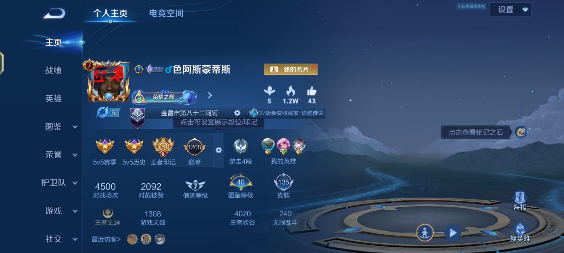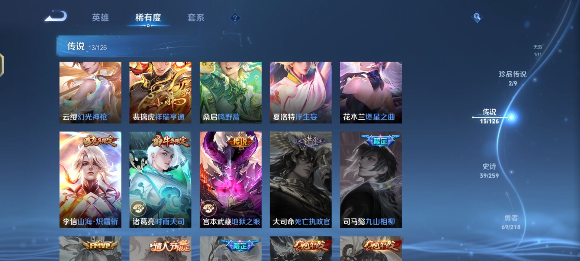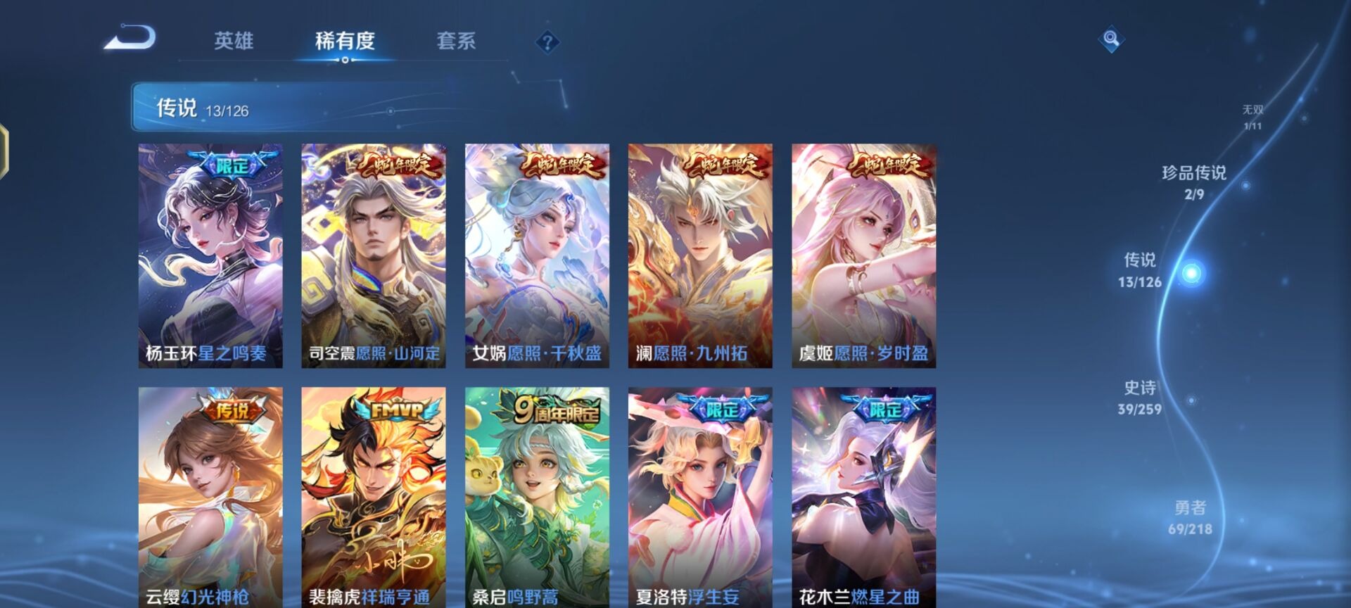 - PX_2088151-实名: 可修改 贵族等级: V7 英雄数: 122 皮肤数: 242 传说皮: 黄金射手座,挚爱之约,神器·狴犴令,山海·炽霜斩,燃星之曲,浮生妄,幻光神枪 限定皮: 李小龙,奔雷神使,梁祝,龙胆,寅虎·御盾,武陵仙君,高山流水,猪悟能,时之祈愿-云中君,时之祈愿-瑶,百木心枪,玉兔公主,匿光决锋者,深海之息,五谷丰年,鸣野蒿,逐霄战戟,愿照·山河定