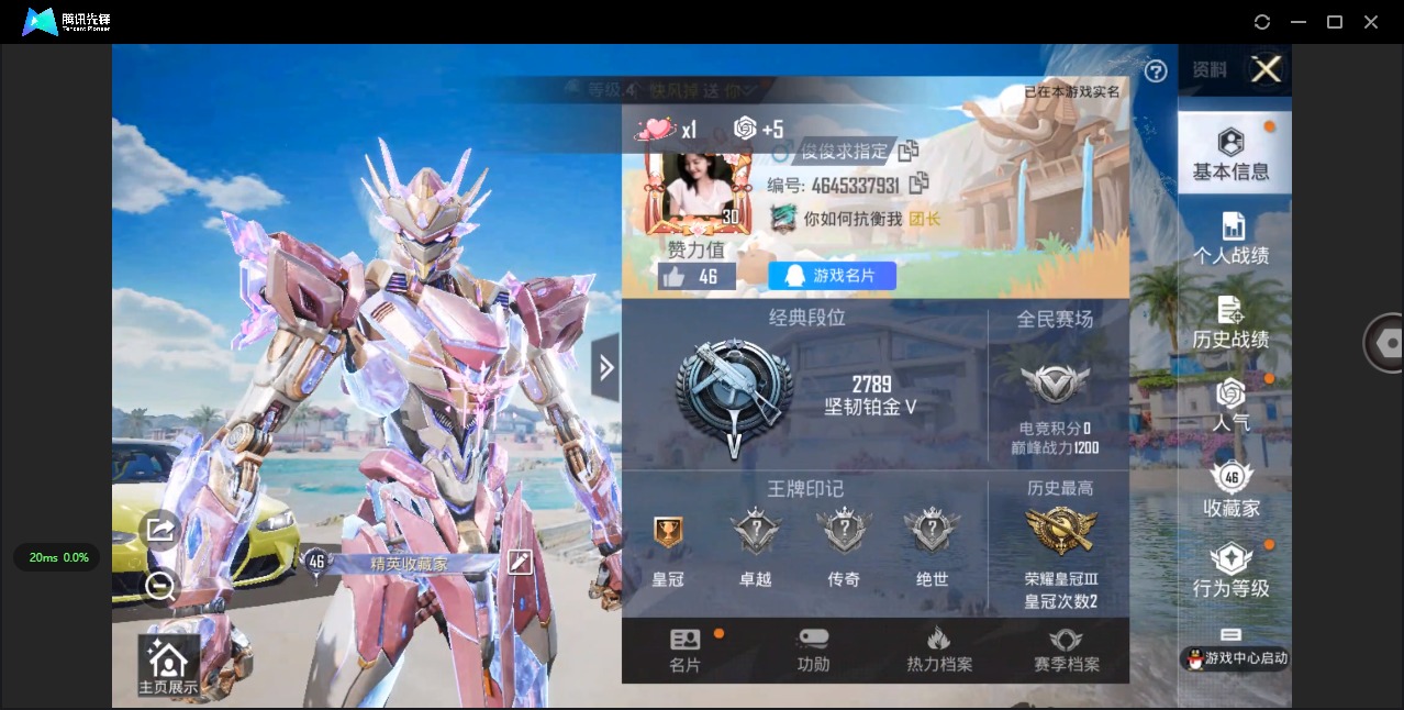 - [11647673]可二次 可修改实名 排位资格:有 5王者武器 43V武器 1V角色 16皮肤 可排位 武器:AWM-裁决,AK12-天启,COP-白鲨,手雷-动感闪耀,幻灵之锋,烟雾弹-雷暴,王者之魄高爆手雷,烟雾弹-幻灵,高爆手雷-雷霆,王者云击,高爆手雷-雷暴王者,柯尔特-冠军之特,柯尔特-荣耀世冠白鲨2023,闪光弹-雷暴,烟雾弹-雷霆,高爆手雷-雷暴,闪光弹-雷暴王者,高爆手雷-玄豹,闪光弹-雷霆,高爆手雷-幻灵,屠龙,修罗-古蛇迷踪,Barrett-毁灭,M4A1-雷神,天神-动感闪耀,王者之锋-觉醒版,QBZ03-天罚,手雷-云海游龙,烟雾弹-玄豹,王者之魄闪光弹,闪光弹-玄豹,沙鹰-天神,M200-幻神,丛林匕首-玄豹,闪光弹-幻灵,雷霆之锋,金色蔷薇-古蛇迷踪,沙鹰-修罗,龙啸-烈火龙威,屠龙-动感闪耀