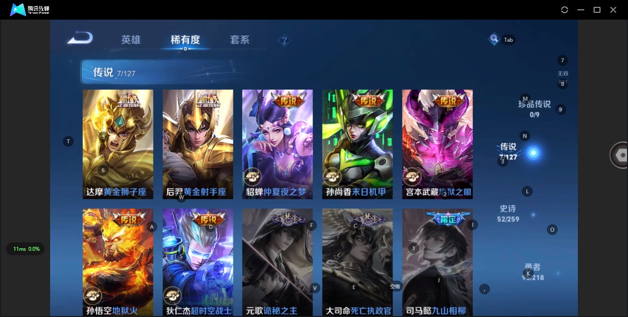 - [11968791]V7 1典藏 3传说 124英雄 142皮肤 可修改实名 优质装备:弑枪猎影(韩信典藏),碎云 珍宝阁皮:妄想食味 限定皮:凤求凰(白切鸡),星穹之声,遇见飞天,游园惊梦,梁祝,逐梦之星,纯白花嫁 史诗皮:遇见神鹿,紫霞仙子,苍穹之光,电玩小子(小书包),黄金分割率,特工魅影,千年之狐,江河有灵,高渐离燃音魔法,蒙恬荣光圣徽,偶像歌手,暗夜猫娘,乱世虎臣,水果甜心,星夜王子,心灵骇客,暗隐猎兽者,鬼剑武藏,舞动绿茵,纤云弄巧,缤纷独角兽,乘风破浪,逐浪之夏,水晶猎龙者,金属风暴,圣诞恋歌,鹰眼统帅,暗夜贵公子,魅力维加斯,无心