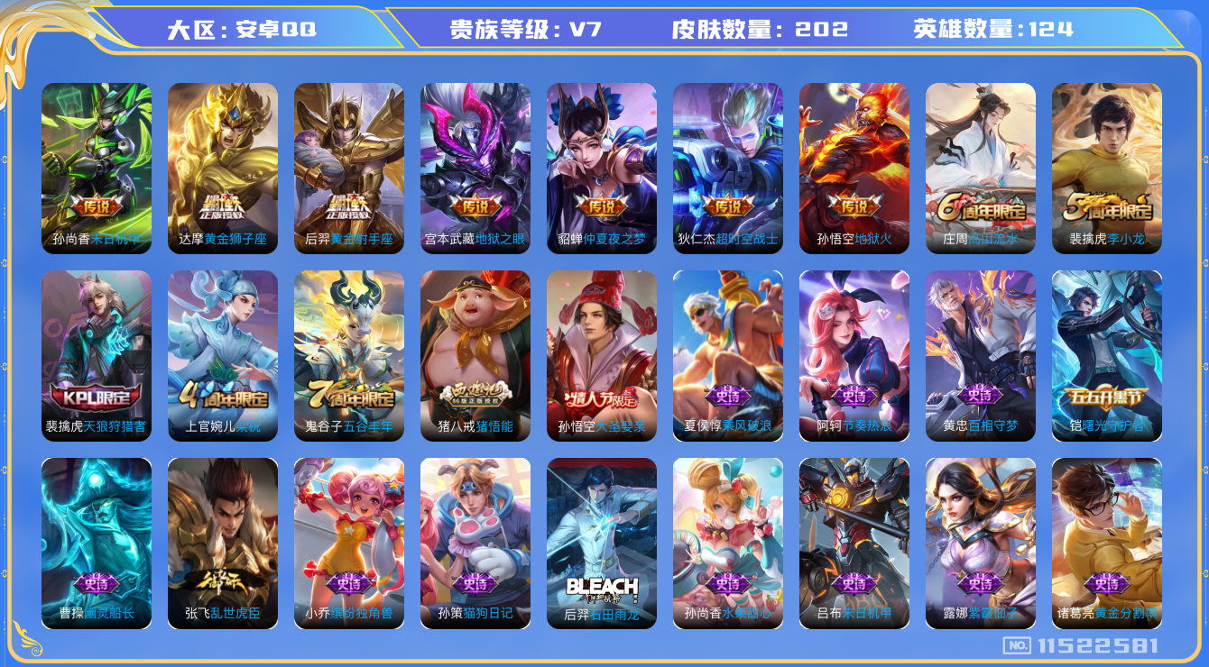 [11522581]V7 7传说 124英雄 202皮肤 可修改实名 优质装备:黄金狮子座,黄金射手座,末日机甲-孙尚香(绿蚂蚱),地狱火,仲夏夜之梦(大飞蛾),地狱之眼,超时空战士-狄仁杰 珍宝阁皮:女武神 限定皮:高山流水,五谷丰年,梁祝,天狼狩猎者,李小龙,猪悟能,大圣娶亲 史诗皮:石田雨龙,百相守梦-黄忠,紫霞仙子,黄金分割率,特工魅影,千年之狐,龙骑士(小龙虾),冰冠公主,末日机甲-吕布,猫狗日记-孙策,乱世虎臣,节奏热浪,女仆咖啡,摇滚巨星,水果甜心,心灵骇客,功夫厨神,暗隐猎兽者,幽灵船长,鬼剑武藏,纤云弄巧,繁星吟游(呼啦呼啦),拒霜思,缤纷独角兽,乘风破浪,逐浪之夏,水晶猎龙者,曙光守护者,金属风暴,原初追逐者,鹰眼统帅,黎明之约,无心,未来纪元-赵云