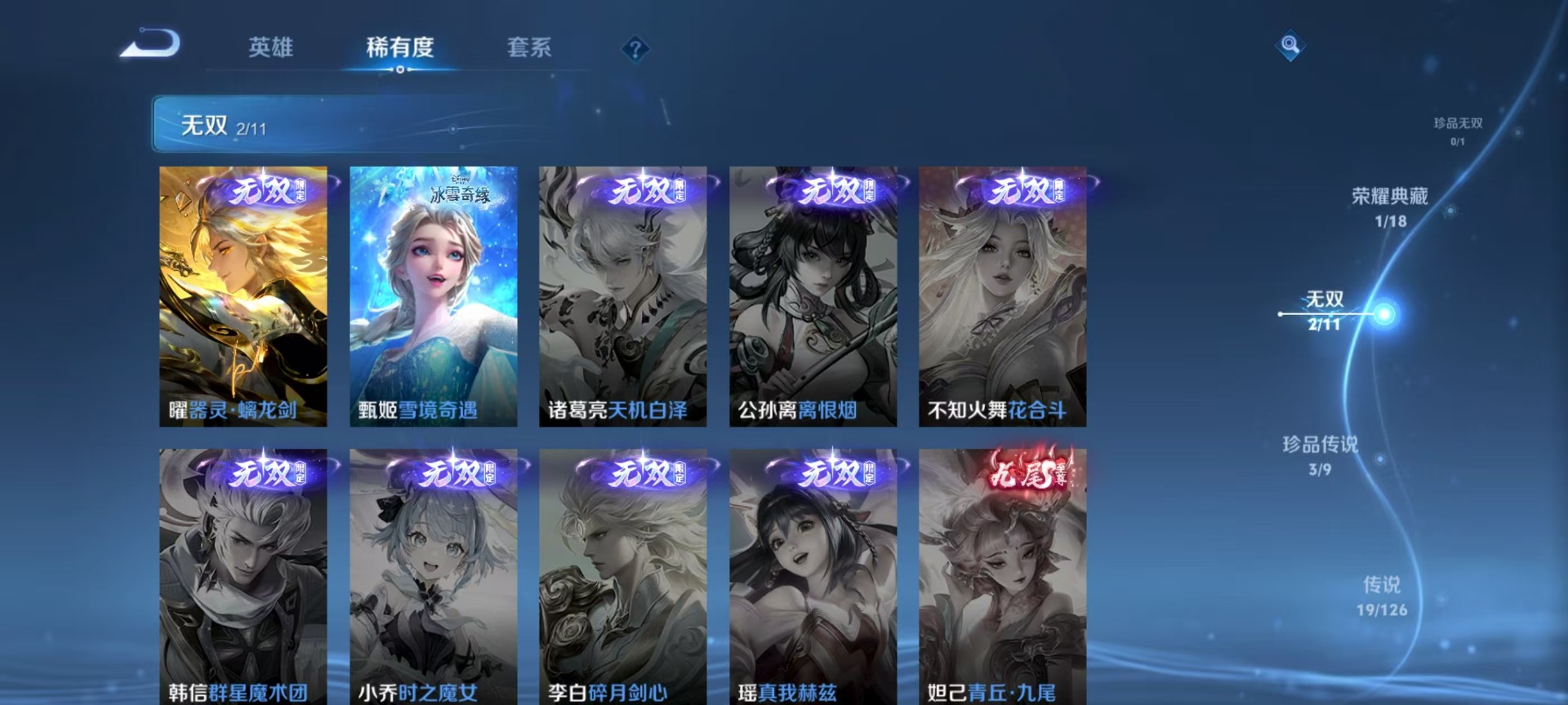 - [11741601]V8 1无双 8传说 124英雄 313皮肤 可修改实名 女号 优质装备:青丘·九尾(妲己无双),碎云,青丘·九尾,澜逐花归海 传说皮:乘龙·问璇玑(孙尚香年限),幻光神枪 珍宝阁皮:妄想食味,蔷薇恋人 限定皮:愿照·千秋盛(女娲年限),鸣野蒿,前尘镜,五谷丰年,梁祝,逐梦之星,李小龙,逐梦之影,孙行者,一生所爱,大圣娶亲,玉兔公主 史诗皮:鸭鸭历险记-刘禅,化蝶舞,龙之律动,雪豹·霜爪,茶境仙,芈月浮光幕影,上官婉儿群星魔术团,蔬乡物语(鲁班七号),百相守梦-百里守约,织梦人,遇见神鹿,紫霞仙子,黄金分割率,特工魅影,千年之狐,江河有灵,真我赫兹(百里守约),百解令(蒙犽),高渐离燃音魔法,匿光破解者,冰冠公主,青蛇,晚萤,电玩·爆裂旋风,暗夜猫娘,银翎春语,猫狗日记-孙策,猫狗日记-大乔,时之恋人-孙尚香,节奏热浪,女仆咖啡,摇滚巨星,水果甜心,星夜王子,心灵骇客,功夫厨神,暗隐猎兽者,幽灵船长,鬼剑武藏,心灵战警,舞动绿茵,诗语江南,纤云弄巧,繁星吟游(呼啦呼啦),拒霜思,缤纷独角兽,乘风破浪,逐浪之夏,水晶猎龙者,曙光守护者,热力回旋,箭羽风息,唤灵魅影,金属风暴,原初追逐者,圣诞狂欢,圣诞恋歌,鹰眼统帅,魅力维加斯,无心,未来纪元-赵云