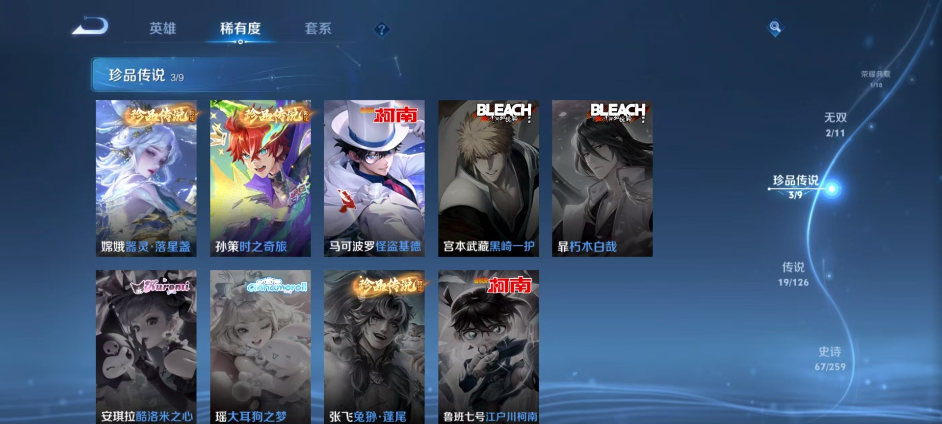 - PX_2106926-【小国标云缨】实名: 可修改 贵族等级: V10 英雄数: 124 皮肤数: 450 荣耀水晶: 武则天,天鹅之梦,星空梦想,倪克斯神谕,活力突击,九霄神辉,赤影疾锋 无双皮: 花合斗,离恨烟 珍品传说: 江户川柯南,怪盗基德,兔狲·蓬尾 星传说: 未来机甲,金色仲夏夜 传说皮: 黄金狮子座,黄金白羊座,猫影幻舞,久胜战神,炽阳神光,末日机甲-孙尚香,仲夏夜之梦,飞鸢探春,胖