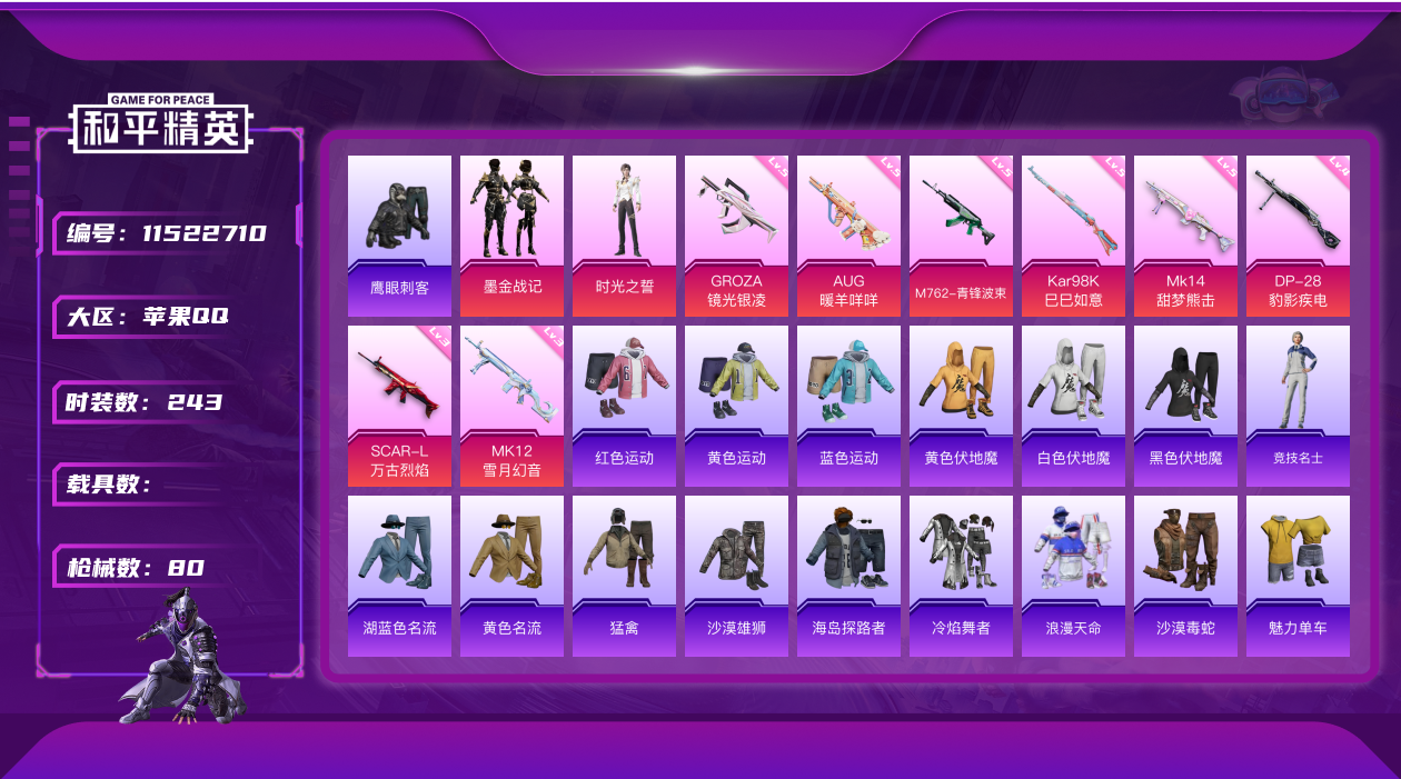[11522710]2粉装 8特效枪 2印记 可二次 可修改实名 身法装备:暗影哥特(红眼罩) 优质装备:SCAR-L 万古烈焰,M762-青锋波束,GROZA-镜光银凌,AUG-暖羊咩咩,MK12-雪月幻音,墨金战记,MK14-甜梦熊击,时光之誓,Kar98K-巳巳如意 热门装扮:鹰眼刺客 五级特效枪:五级M762-青锋波束,五级GROZA-镜光银凌,五级Kar98K-巳巳如意,五级MK14-甜梦熊击,五级AUG-暖羊咩咩 四级特效枪:四级DP-28-豹影疾电 三级特效枪:三级MK12-雪月幻音,三级SCAR-L-万古烈焰 紫色装扮:SS30特训套装,冷焰舞者,SS31特训套装,云朵鹅,雪绒豹,SS33特训套装,顶瓜瓜,灵公主,缤纷果语,蓝色运动,超能勇士,魅力单车,黄色伏地魔,黄色名流,黄色运动,黑色伏地魔,冰河战士,龙魂突击队,蝶变,香桃花海,沙漠毒蛇,沙漠雄狮,海岛探路者,深蓝色名流,湖蓝色名流,白色伏地魔,红色运动,猛禽,雏菊兔兔,萝兰蝴蝶,火种守护者(套装-火种守卫者),星途旅人,鱼渊荷华,燕燕于飞,森林游猎者,暗影哥特(红眼罩),青团波波,糖糖葫芦,竞技名士,智谋强哥,粉红小猪,浪漫天命,大橘大利,星渊小夜曲,智慧之神,粉恋花,蓝冰羽,紫幽梦,SS32特训服(SS32特训套装),荧光绘影,恋语绒绒 优质战备:星途旅人降落伞,BEARBRICK降落伞,忍者神龟降落伞,幻星舰长降落伞,绯果甜心降落伞,动力核心飞行器,月影灵韵降落伞,月下星之子降落伞,彩虹独角兽降落伞