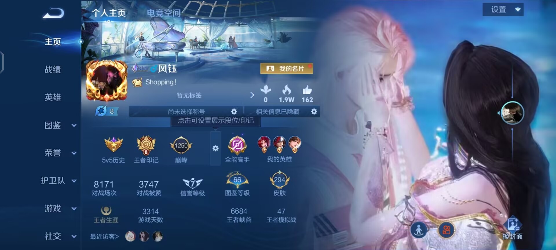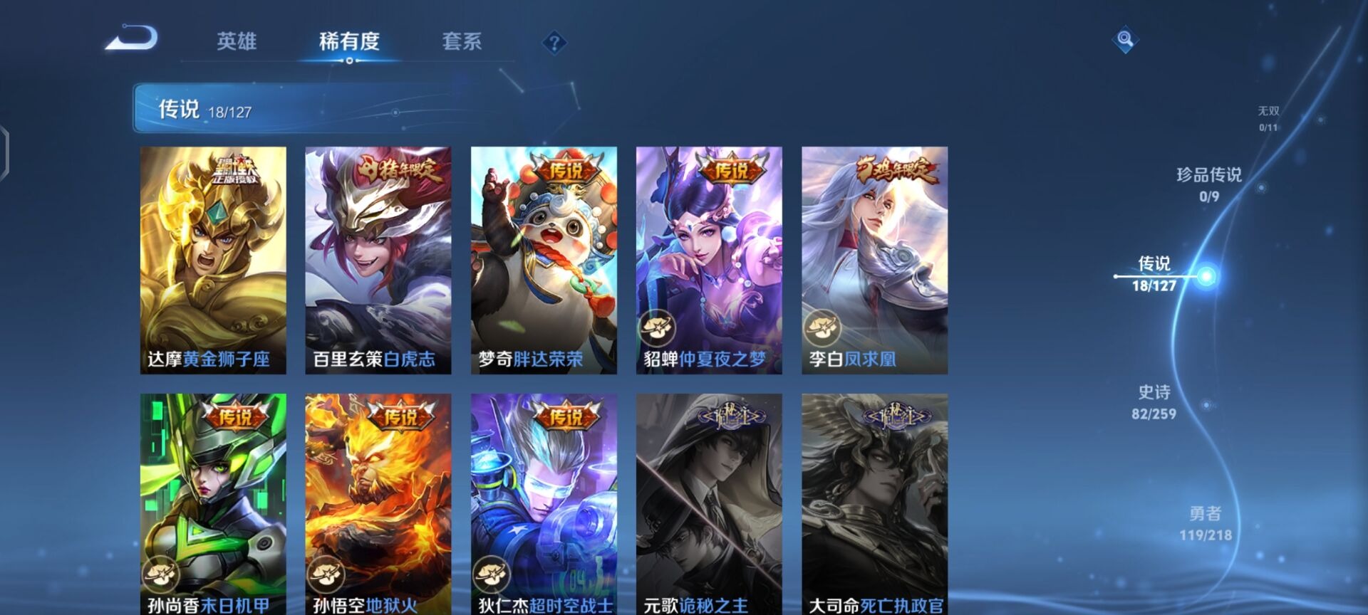- PX_2094292-贵族等级: V8 英雄数: 125 皮肤数: 288 荣耀水晶: 天鹅之梦,幻阙歌 星传说: 金色仲夏夜,无限倾慕 传说皮: 黄金射手座,地狱火,仲夏夜之梦,超时空战士-狄仁杰,炽翼辉光 限定皮: 冰锋战神,遇见飞天,李小龙,游园惊梦,梁祝,引擎之心,龙胆,天狼溯光者,奇迹圣诞,逐梦之星,白虎志,霸王别姬-项羽,霸王别姬-虞姬,高山流水,猪悟能,寅虎·赤拳,玉兔公主,深海之息
