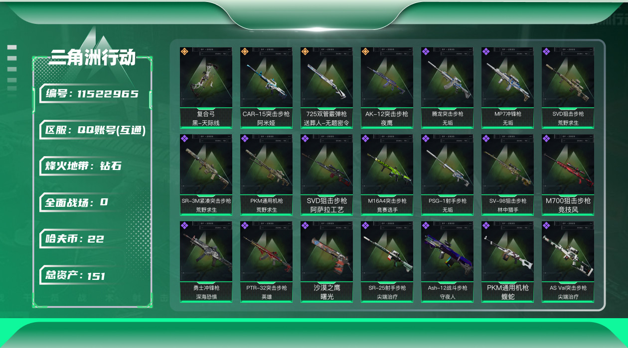[11522965]总资产:151.8 0近战传说 4传说枪械 顶级安全箱(3×3)9.15号到期 段位:上等兵 可二次 可修改实名 烽火地带段位:钻石 全面战场段位:上等兵 哈夫币:22.973 传说武器皮肤:AK-12突击步枪-夜鹰,复合弓-黑-天际线,CAR-15突击步枪-阿米娅,725双管霰弹枪-送葬人-无题密令 史诗武器皮肤:PKM通用机枪-蝮蛇,SR-25射手步枪-尖端治疗,PKM通用机枪-荒野求生,AS Val突击步枪-尖端治疗,Ash-12战斗步枪-守夜人,SR-3M紧凑突击步枪-荒野求生,勇士冲锋枪-深海恐惧,AKM突击步枪-林中猎手,M16A4突击步枪-竞赛选手,PKM通用机枪-守夜人,SVD狙击步枪-荒野求生,SV-98狙击步枪-林中猎手,PTR-32突击步枪-英雄,PSG-1射手步枪-无垢,腾龙突击步枪-无垢,MP7冲锋枪-无垢,沙漠之鹰-曙光,SVD狙击步枪-阿萨拉工艺,M700狙击步枪-竞技风
