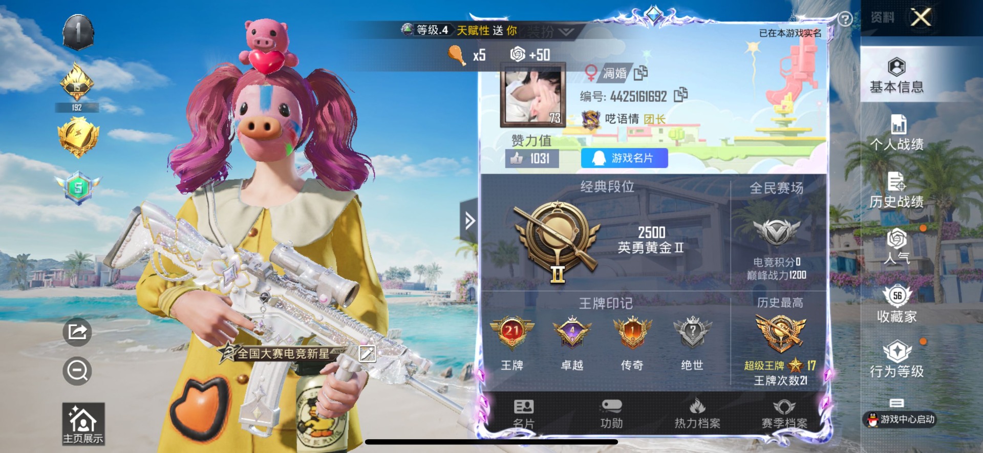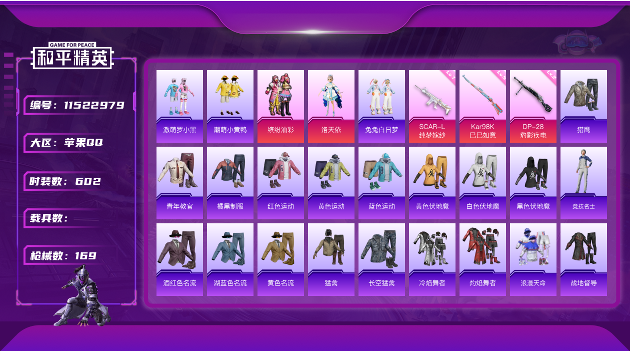 [11522979]2粉装 3特效枪 21印记 可二次 可修改实名 女号 优质装备:缤纷油彩(猪妹猪脸妹),洛天依,SCAR-L纯梦嫁纱,七级SCAR-L-纯梦嫁纱,Kar98K-巳巳如意 热门装扮:兔兔白日梦,激萌罗小黑,潮萌小黄鸭 稀有枪皮:DP-28-豹影疾电 五级特效枪:五级Kar98K-巳巳如意 二级特效枪:二级DP-28-豹影疾电 紫色装扮:田园牧歌,轻风白浪,和煦暖阳,SS22特训,飞狐塔尔斯,SS23特训,幻彩翩翩,灵蜜圈圈,妙红点点,娇憨猪猪,萌趣咩咩,暖心熊熊,SS21特训,SS31特训套装,人气偶像,军械专家,冷焰舞者,SS30特训套装,SS33特训套装,青涩时光,SS20特训,青春冒险家,潮流游乐家,SS15特训,时空追击者,暴风机械师,SS16特训,银白舞王,SS13特训,治愈之星,科技之星,SS14特训,怪笑疯兔,萌趣颜团子,特种颜团子,SS19特训,吉莉礼服,天籁歌者,瑞龙福将,团圆交子,SS17特训,炫光向阳,异彩先驱,SS18特训,都市魅力,酒红色名流,野性战心,金鼠迎春,长空猛禽,霓虹极客,霓虹街区,青年教官,缤纷果语,耀眼新星,荣耀,蓝彩潮人,蓝色运动,虎虎生威吉莉,街头潮人,飞行日记,龙腾端午,魅力单车,鹤鸣,麻辣教官,黄色伏地魔,黄色名流,黄色运动,黑色伏地魔,龙的传人,龟仙人,冰河战士,龙魂突击队,蝶变,香桃花海,极速红龙,柠萌假日,格斗先锋,橘黑制服,深蓝色名流,滨海假日,幻影武者,夏日音浪,夜莺强袭者,完美偶像,帅气教官,幻世战舞者,怒火燎原,恋恋初桃,战地督导,湖蓝色名流,滨海厨神,绮丽涂鸦,白熊同盟,白色伏地魔,破晓战魂,破蛋小黄鸡,甜蜜告白,福星高照,空岛之星,空投萌叽,竞技达人朋克,红色运动,甜蜜熊情侣,王牌教练,牛气冲天,灰色格斗者,灼焰舞者,炫蓝之夏,牛气满满,猛禽,特殊使命,特训学院,猎鹰,镭射皇者,粉日山川,SS29特训,星途旅人,纯真浪花,热情海星,SS28特训,卖崽青蛙,听雨铃兰,玉兔迎春,巳巳如意,青团波波,糖糖葫芦,棉花软糖,竞技名士,街头风暴,惊鸿侠骨,甜梦熊熊,神气柴柴,懵萌河马,SS24特训(SS24特训套装),绚紫流光,SS25特训,锦衣飞扬,粉红小猪,SS27特训,无暇誓言,明鸳圣池,牛仔情诗,浪漫天命,SS26特训,春光漫游,快闪甜心,萌主吾皇,SS7特训,深蓝冒险家,迷域探索者,SS8特训,大橘大利