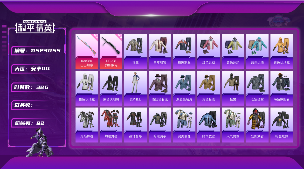 [11523055]2特效枪 可二次 可修改实名 稀有枪皮:Kar98K-巳巳如意 五级特效枪:五级Kar98K-巳巳如意,五级DP-28-豹影疾电 紫色装扮:SS22特训,SS23特训,SS21特训,SS30特训套装,人气偶像,冷焰舞者,青涩时光,SS31特训套装,SS33特训套装,时希公主,长空猛禽,都市魅力,酒红色名流,野性战心,青年教官,缤纷果语,耀眼新星,蓝彩潮人,蓝色运动,龙的传人,魅力单车,麻辣教官,黄色伏地魔,黄色名流,黄色运动,黑色伏地魔,龟仙人,冰河战士,龙魂突击队,蝶变,绮丽涂鸦,暗黑骑手,极速红龙,柠萌假日,橘黑制服,海岛探路者,深蓝色名流,暗金炫舞,湖蓝色名流,完美偶像,帅气教官,幻影武者,战地督导,白色伏地魔,破晓战魂,破蛋小黄鸡,王牌教练,空岛之星,竞技达人朋克,红色运动,猛禽,灼焰舞者,猎鹰,牛气满满,SS29特训,星途旅人,巳巳如意,异域银装,鱼渊荷华,燕燕于飞,竞技名士,许七安,SS25特训,SS24特训(SS24特训套装),SS27特训,SS26特训,大橘大利,耀粉歌者,SS32特训服(SS32特训套装),白糯汤圆,恋语绒绒,光之冒险 优质战备:霓虹漫游飞行器,星途旅人降落伞,江南烟雨降落伞,临安公主降落伞