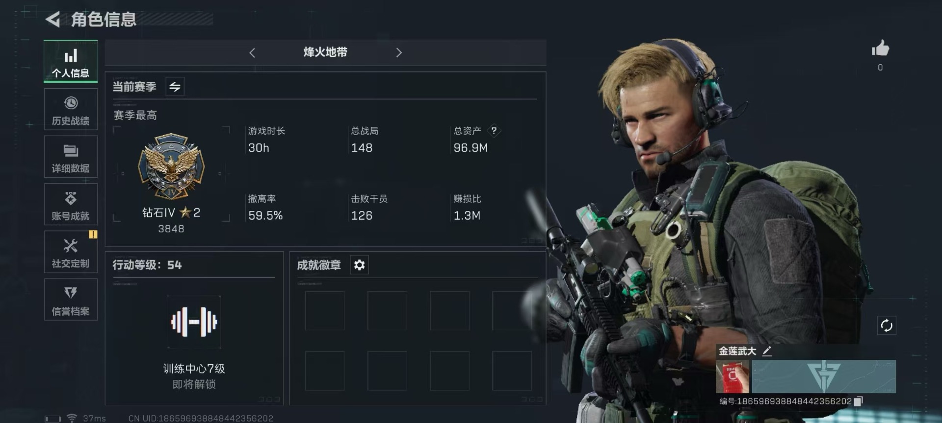 [11523072]总资产:96.9 可二次 可修改实名 烽火地带段位:钻石 全面战场段位:无段位 哈夫币:6.331