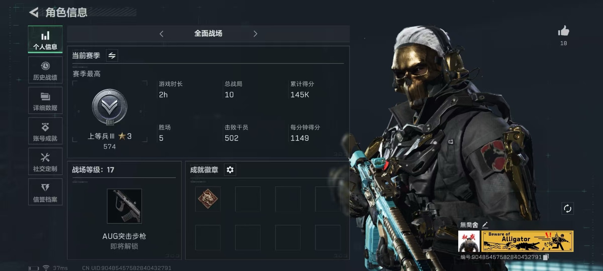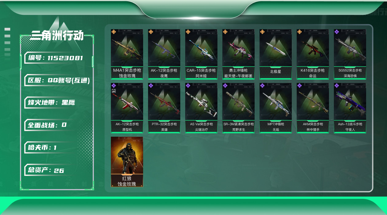 [11523081]总资产:26.3 1干员外观 1近战传说 6传说枪械 高级安全箱(9.17到期) 可二次 可修改实名 优质装备:近战-北极星,K416突击步枪-命运(典藏) 烽火地带段位:黑鹰 全面战场段位:上等兵 哈夫币:1.318 传说武器皮肤:AK-12突击步枪-夜鹰,CAR-15突击步枪-阿米娅,勇士冲锋枪-能天使-午夜邮差,M4A1突击步枪-蚀金玫瑰 史诗武器皮肤:AK-12突击步枪-原型机(典藏),AS Val突击步枪-尖端治疗,Ash-12战斗步枪-守夜人,SR-3M紧凑突击步枪-荒野求生,SG552突击步枪-深海恐惧,AKM突击步枪-林中猎手,PTR-32突击步枪-英雄,MP7冲锋枪-无垢 干员外观:红狼-蚀金玫瑰