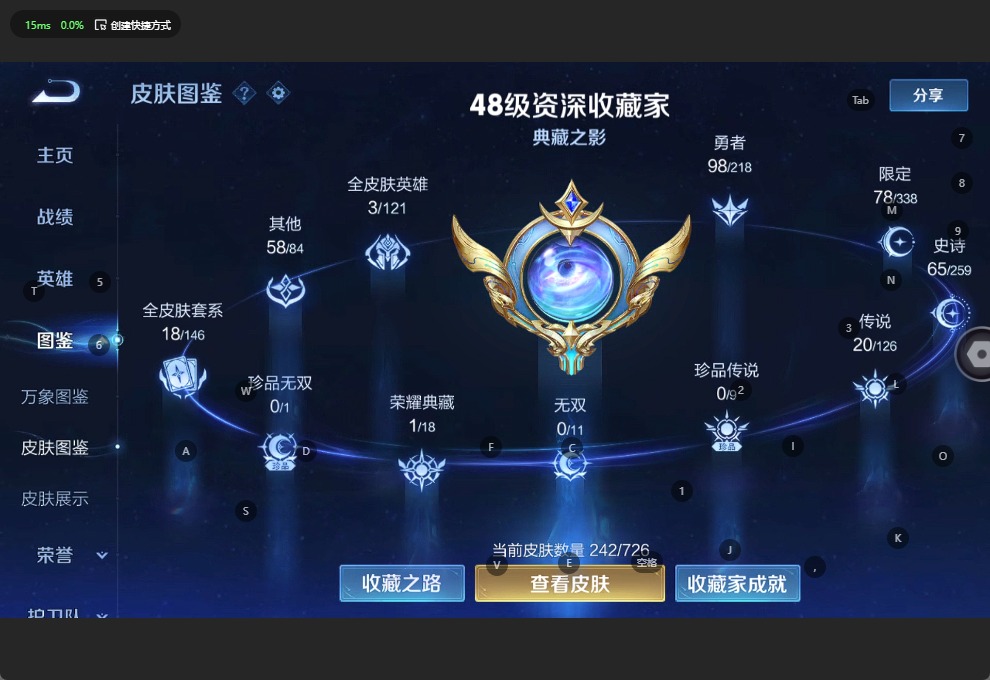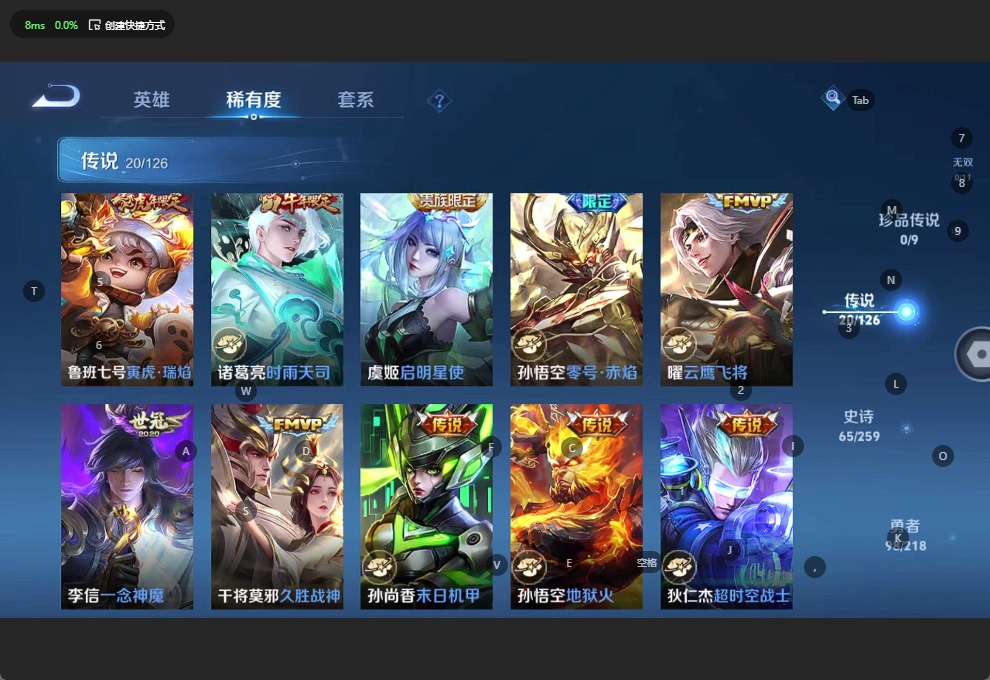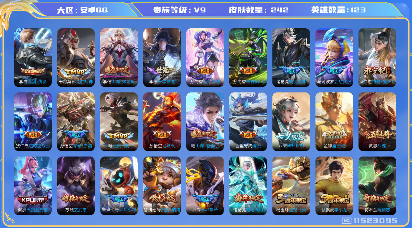 - [11679186]实名: 可修改 贵族等级: V10 英雄数: 125 皮肤数: 466 荣耀水晶: 鸣剑·曳影,全息碎影,九霄神辉 无双皮: 碎月剑心,韩信群星魔术团 珍品传说: 兔狲·蓬尾,酷洛米之心,大耳狗之梦,朽木白哉,黑崎一护 传说皮: 黄金狮子座,黄金射手座,绛天战甲,末日机甲-孙尚香,地狱火,仲夏夜之梦,零号·赤焰,时之恋人-刘备,淬星耀世,遇见胡旋,末日机甲-孙策,挚爱之约,挚爱花嫁,无双飞将,碎云,画中仙,妄想实况,艾琳觅芳踪,乘龙·问璇玑,落雪白狼,幻光神枪,祥瑞亨通,星之鸣奏,续相思,诡秘之主 限定皮: 冰锋战神,遇见飞天,李小龙,祈雪灵祝,游园惊梦,梁祝,时雨天司,引擎之心,魔法小厨娘,辉光之辰,异界灵契,天魔缭乱,神威,飞衡,天狼狩猎者,冰霜恋舞曲,逐梦之影,逐梦之光,神奇女侠,美猴王,白虎志,梅西,至尊宝,一生所爱,武陵仙君,如梦令-后羿,大圣娶亲,默契交锋-花木兰,霸王别姬-虞姬,高山流水,孙行者,猪悟能,寅虎·展翼,补天,百木心枪,玉兔公主,启示之音,匿光决锋者,无尽星芒,五谷丰年,神器·万象笔,山海·碧波行,齐天大圣,至美·化雀舞,至美·乘鲤谣,鸣野蒿,陌上桑,愿照·千秋盛,愿照·众生和,愿照·山河定,愿照·岁时盈,愿照·福禄聚,愿照·九州拓