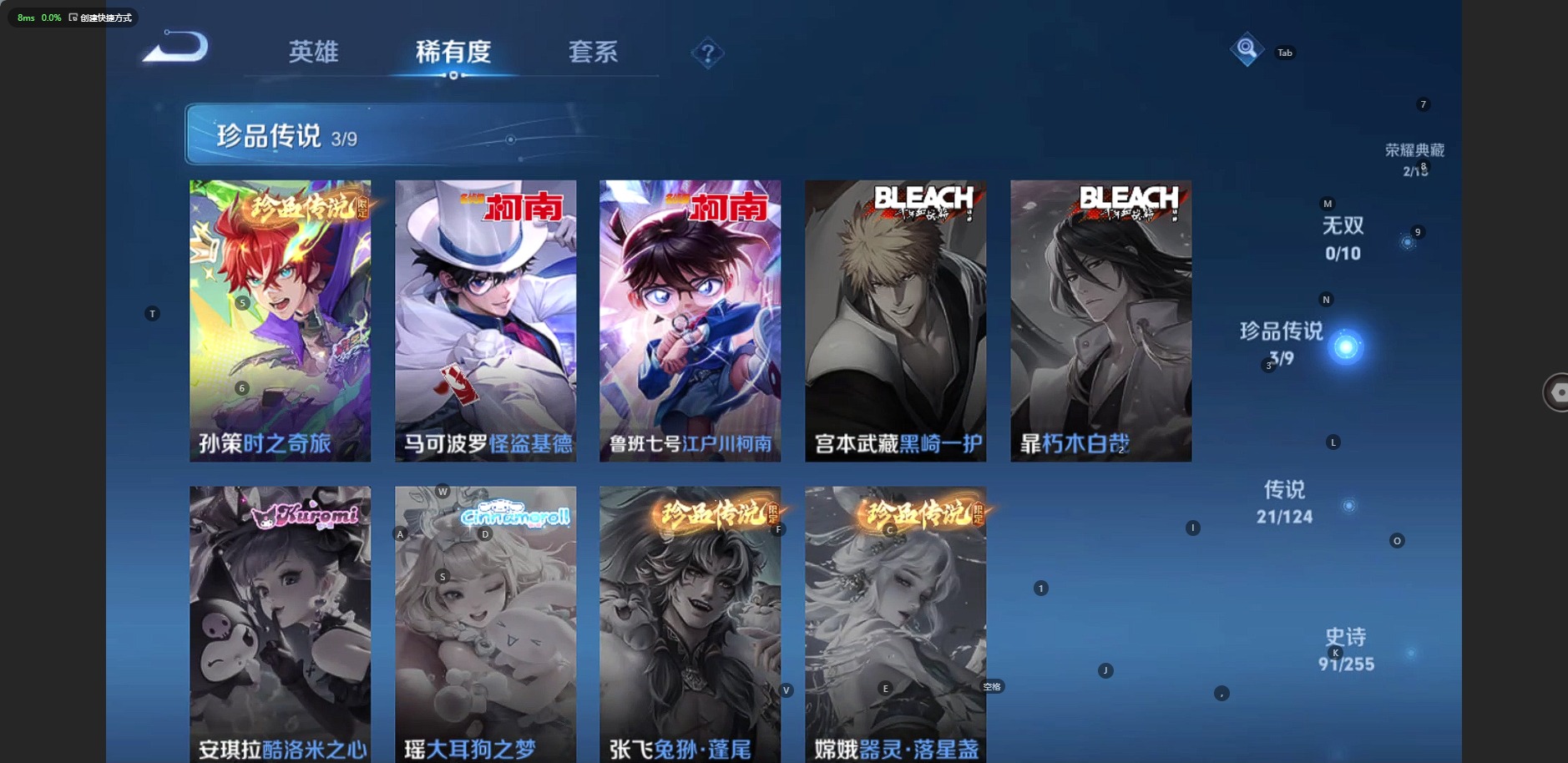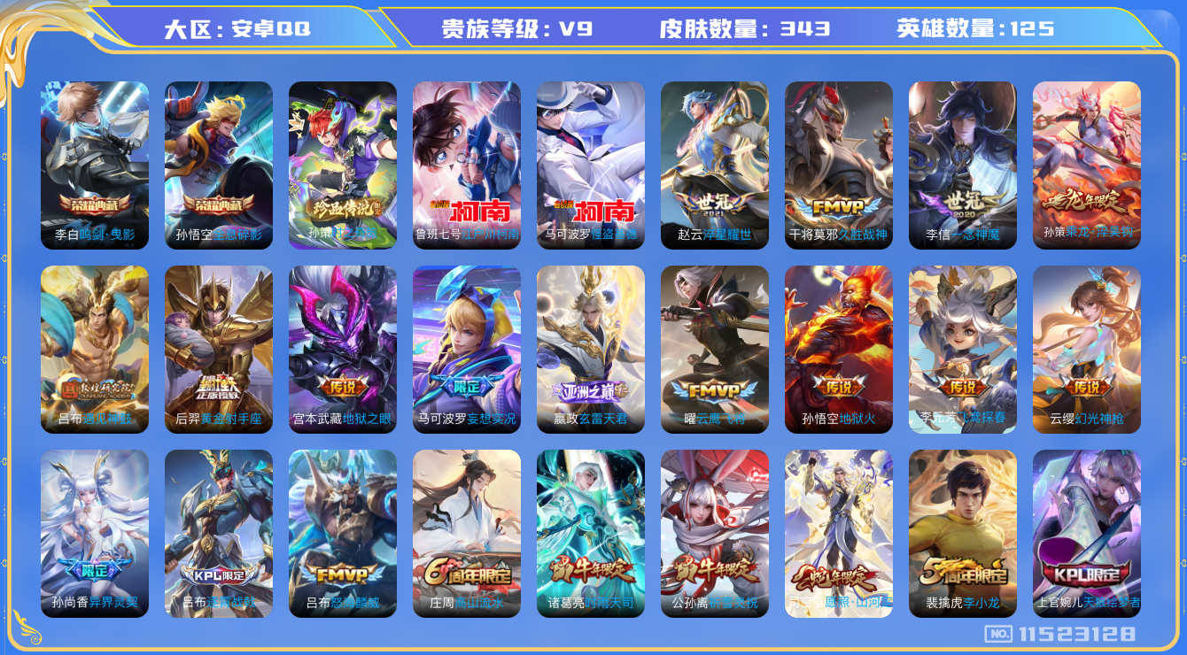 [11523128]V9 2典藏 3珍品传说 21传说 125英雄 343皮肤 可修改实名 荣耀水晶:鸣剑·曳影,全息碎影(猴子典藏) 珍品传说:江户川柯南,怪盗基德,时之奇旅-孙策 传说皮:乘龙·淬吴钩(孙策年限),幻光神枪,玄雷天君,黄金射手座,地狱火,地狱之眼,一念神魔,淬星耀世,久胜战神,云鹰飞将(小将军),飞鸢探春,妄想实况,遇见神鼓 珍宝阁皮:万物之道,蔷薇恋人,玩趣恶龙 限定皮:愿照·山河定(司空震年限),逐霄战戟,陌上桑,鸣野蒿,至尊宝,白虎志(电光耗子),异界灵契(白毛香),傲雪梅枪,时雨天司(水龙头),神威(电光马子),高山流水,怒海麟威,降魔,五谷丰年,祈雪灵祝(雪兔子),天狼绘梦者,李小龙,逐梦之影,大圣娶亲 史诗皮:百相守梦-百里守约,星界战将,茶境仙,器灵·浮梦炉,化蝶舞,灵蛊蚀心,龙之律动,破空之剑,遇见神鹿,紫霞仙子,电玩小子(小书包),白龙吟,黄金分割率,特工魅影,千年之狐,永昼,江河有灵,高渐离燃音魔法,蒙恬荣光圣徽,偶像歌手,青蛇,晚萤,暗夜猫娘,无限星赏官,末日机甲-吕布,猫狗日记-孙策,猫狗日记-大乔,乱世虎臣,节奏热浪,修罗,女仆咖啡,摇滚巨星,水果甜心,绅士熊喵,天才门将,星夜王子,心灵骇客,功夫厨神,德古拉伯爵,暗隐猎兽者,幽灵船长,鬼剑武藏,心灵战警,乐园奇幻夜,天秀·启明,舞动绿茵,地狱岩魂,纤云弄巧,拒霜思,缤纷独角兽,乘风破浪,逐浪之夏,月团寄思,水晶猎龙者,曙光守护者,金属风暴,原初追逐者,圣诞狂欢,圣诞恋歌,鹰眼统帅,魅力维加斯,黎明之约,赏金猎手,无心,未来纪元-赵云