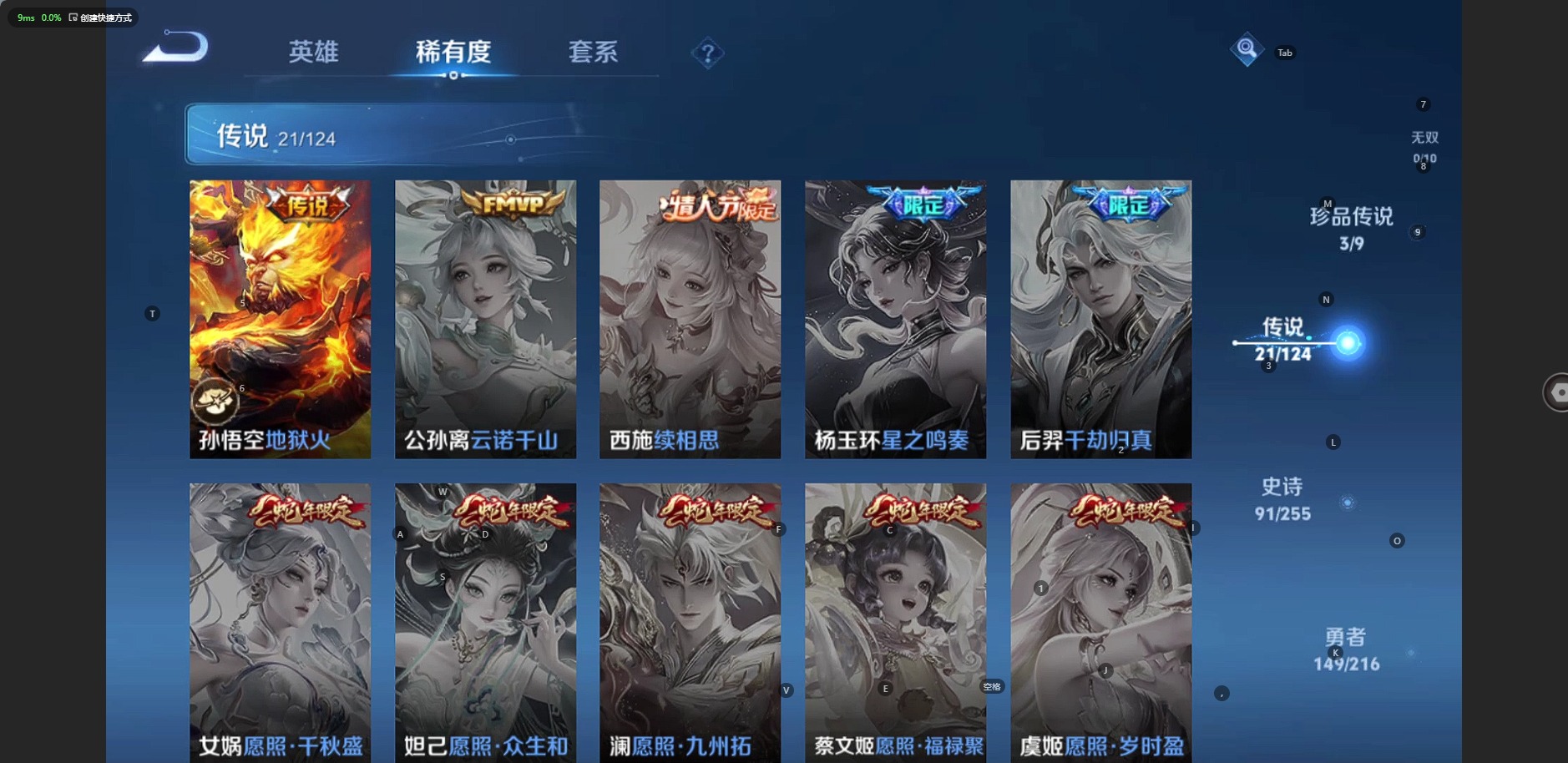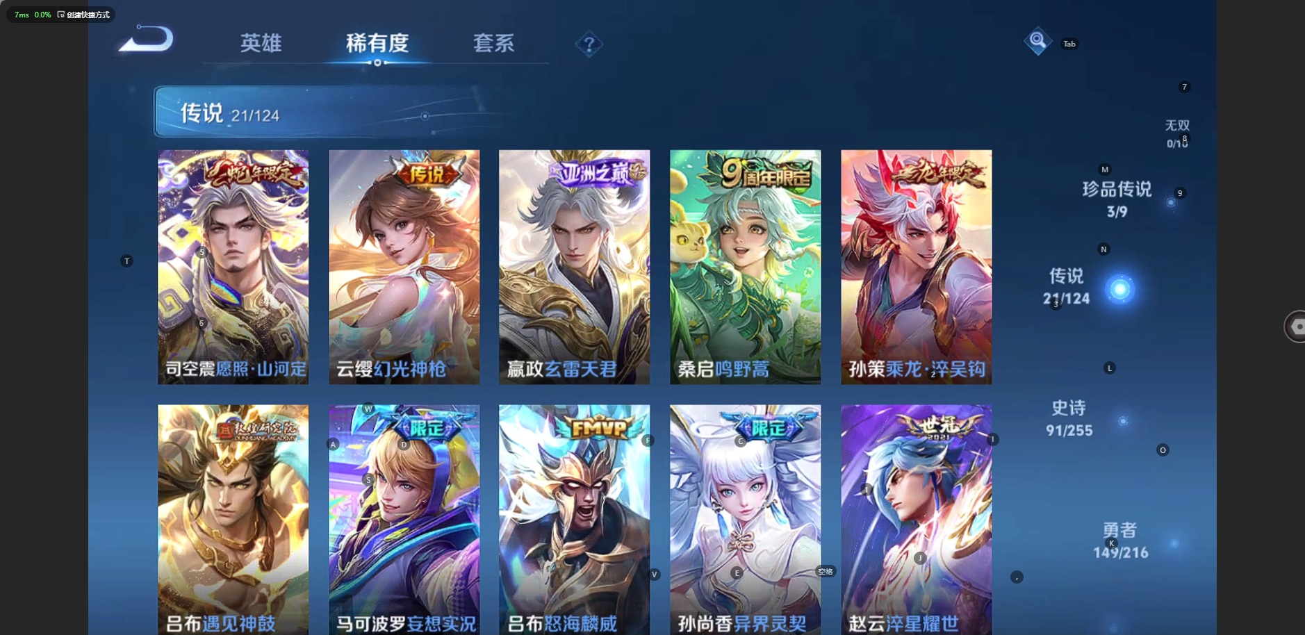 - [12086210]V7 1典藏 12传说 124英雄 221皮肤 可修改实名 优质装备:九霄神辉(木兰典藏),黄金狮子座,云鹰飞将(小将军),一念神魔,胖达荣荣,李逍遥,超时空战士-狄仁杰,山海·炽霜斩(李信年限),山海·苍雷引(电光曜子),涂山容容 传说皮:幻光神枪 珍宝阁皮:万物之道,蔷薇恋人,玩趣恶龙 限定皮:愿照·九州拓(澜年限),逐霄战戟,鸣野蒿,至尊宝,白虎志(电光耗子),白晶晶,神威(电光马子),高山流水,五谷丰年,冰锋战神,梁祝,御风骁将(吕布年限),天狼绘梦者,李小龙,孙行者,大圣娶亲,冰霜恋舞曲,美猴王,神器·万象笔 史诗皮:化蝶舞,星界战将,琥珀纪元伽罗,上官婉儿群星魔术团,百相守梦-黄忠,特工魅影,百解令(蒙犽),高渐离燃音魔法,蒙恬荣光圣徽,时之恋人-孙尚香,修罗,水果甜心,星夜王子,德古拉伯爵,暗隐猎兽者,幽灵船长,鬼剑武藏,心灵战警,天秀·启明,舞动绿茵,地狱岩魂,繁星吟游(呼啦呼啦),乘风破浪,逐浪之夏,水晶猎龙者,曙光守护者,金属风暴,原初追逐者,圣诞狂欢,鹰眼统帅,魅力维加斯,黎明之约,赏金猎手,无心