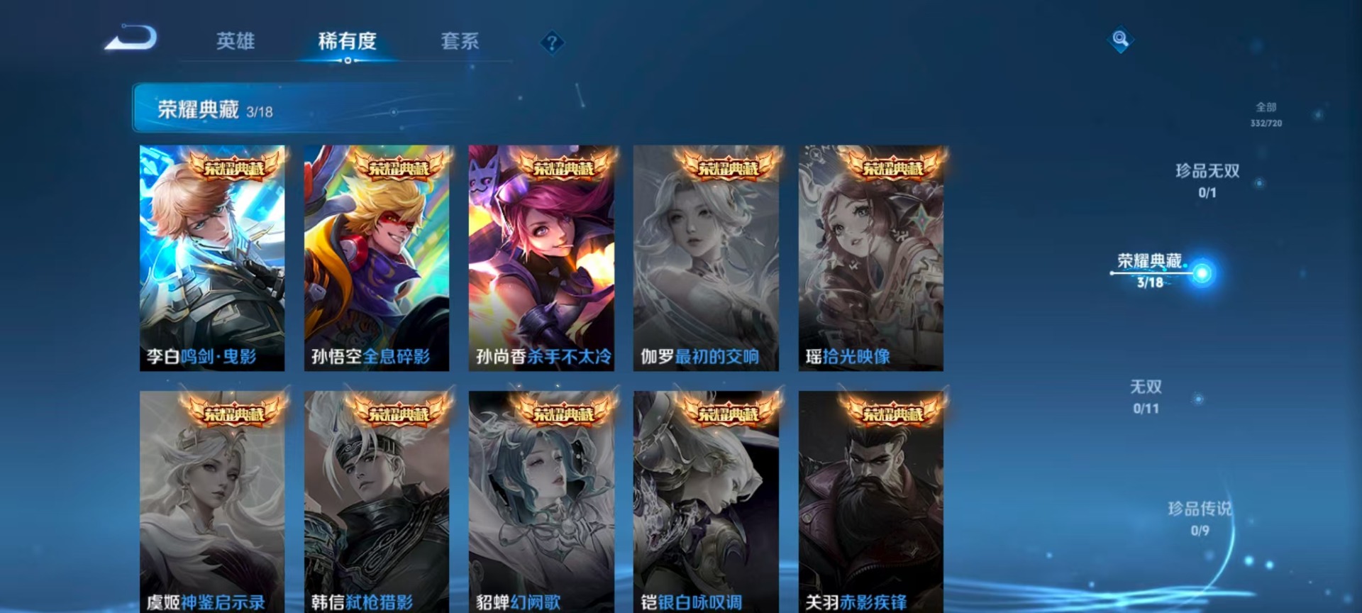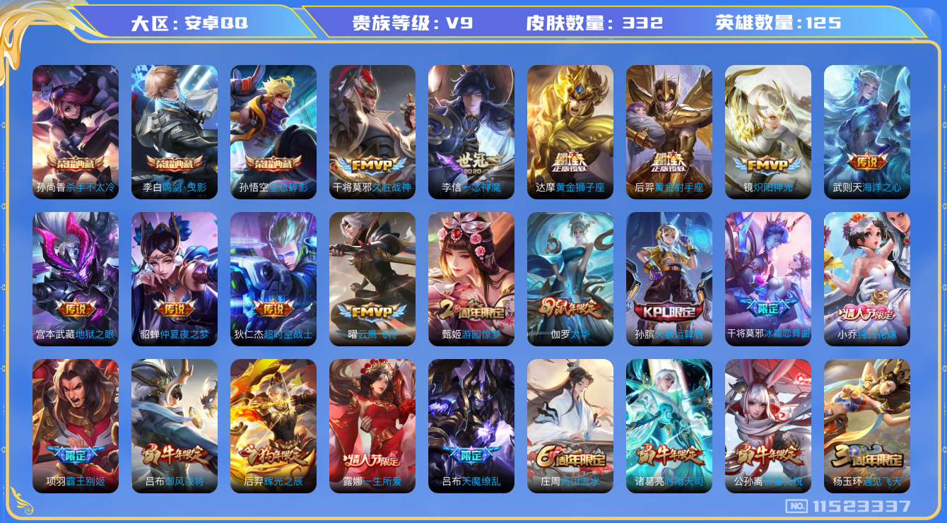 [11523337]V9 3典藏 18传说 125英雄 332皮肤 典藏英雄武则天 可修改实名 荣耀水晶:鸣剑·曳影,全息碎影(猴子典藏),杀手不太冷 传说皮:黄金狮子座,黄金射手座,仲夏夜之梦(大飞蛾),海洋之心,地狱之眼,一念神魔,久胜战神,云鹰飞将(小将军),炽阳神光,超时空战士-狄仁杰 珍宝阁皮:妄想食味,优雅恋人,玩趣恶龙 限定皮:鸣野蒿,至尊宝,白虎志(电光耗子),凤求凰(白切鸡),太华(伽罗年限),梅西,白晶晶,时雨天司(水龙头),神威(电光马子),遇见飞天,高山流水,五谷丰年,冰锋战神,天狼运算者,游园惊梦,梁祝,御风骁将(吕布年限),祈雪灵祝(雪兔子),李小龙,逐梦之影,辉光之辰,霸王别姬-项羽,纯白花嫁,猪悟能,一生所爱,大圣娶亲,天魔缭乱,青春决赛季,冰霜恋舞曲 史诗皮:鸭鸭历险记-刘禅,龙之律动,百相守梦-黄忠,怒海争锋,百相守梦-周瑜,幻珠鲛人,遇见神鹿,紫霞仙子,苍穹之光,电玩小子(小书包),白龙吟,黄金分割率,特工魅影,千年之狐,永昼,末日机甲-莱西奥,蒙恬荣光圣徽,冰冠公主,偶像歌手,晚萤,魅语,暗夜猫娘,末日机甲-吕布,猫狗日记-孙策,猫狗日记-大乔,乱世虎臣,节奏热浪,修罗,女仆咖啡,摇滚巨星,水果甜心,绅士熊喵,天才门将,星夜王子,心灵骇客,功夫厨神,德古拉伯爵,暗隐猎兽者,幽灵船长,鬼剑武藏,心灵战警,天秀·启明,舞动绿茵,地狱岩魂,纤云弄巧,繁星吟游(呼啦呼啦),拒霜思,缤纷独角兽,乘风破浪,逐浪之夏,水晶猎龙者,曙光守护者,箭羽风息,金属风暴,原初追逐者,圣诞狂欢,圣诞恋歌,鹰眼统帅,暗夜贵公子,魅力维加斯,黎明之约,赏金猎手,奇遇舞章,无心,未来纪元-赵云