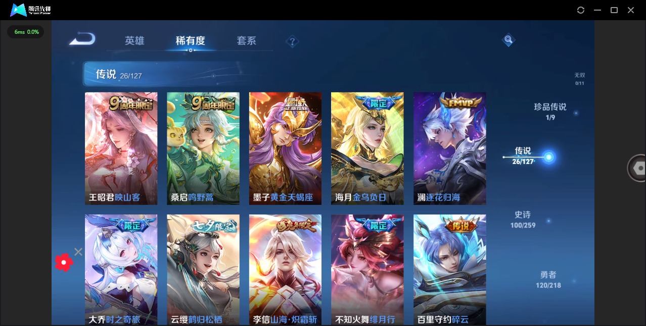 - PX_2072628-02 安卓QQ/非凡王者/80皮肤/106英雄/0典藏/0珍品无双/0无双/0珍品传说/5传说/12史诗/5稀有英雄 【5 传说皮肤】炽阳神光 镜,冠军飞将 花木兰,愿照·九州拓 澜,幻光神枪 云缨,鸣野蒿 桑启, 【12 史诗皮肤】紫霞仙子 露娜,五谷丰年 鬼谷子,无心 元歌,鬼剑武藏 宫本武藏,修罗 橘右京,魅力维加斯 妲己,鹰眼统帅 狄仁杰,猫狗日记 孙策,未来纪元 赵