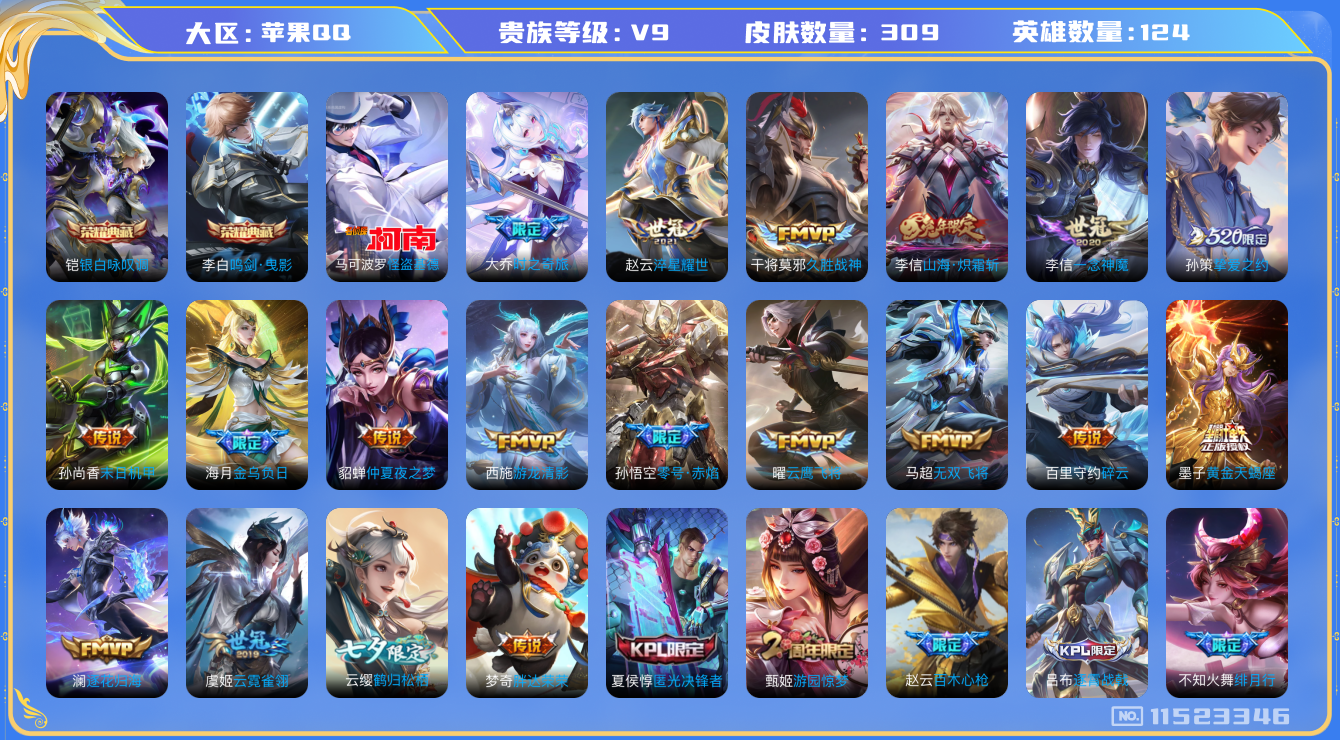 [11523346]V9 2典藏 1珍品传说 26传说 124英雄 309皮肤 可修改实名 优质装备:鸣剑·曳影,银白咏叹调(倪克斯侍卫),怪盗基德,云鹰飞将(小将军),久胜战神,一念神魔,云霓雀翎,末日机甲-孙尚香(绿蚂蚱),仲夏夜之梦(大飞蛾),零号·赤焰,胖达荣荣,游龙清影(小青龙),淬星耀世,挚爱之约,无双飞将,碎云,山海·炽霜斩(李信年限),鹤归松栖(云缨),大乔-时之奇旅,澜逐花归海,金乌负日,黄金天蝎座 珍宝阁皮:妄想食味,女武神,玩趣恶龙 限定皮:逐霄战戟,映山客,鸣野蒿,至尊宝,武陵仙君(小桃花),傲雪梅枪,绯月行,高山流水,匿光决锋者,五谷丰年,游园惊梦,逐梦之音,祈雪灵祝(雪兔子),李小龙,霸王别姬-虞姬,孙行者,猪悟能,青春决赛季,热情桑巴,匿光追影者,寅虎·瑞焰(虎皮蛋子),寅虎·心曲(虎婆),百木心枪,玉兔公主,山海·玄木吟(马可年限) 史诗皮:星界战将,破空之剑,涂山红红,埋骨钱,芈月浮光幕影,上官婉儿群星魔术团,蔬乡物语(鲁班七号),乘龙·聚宝船(安琪拉年限),百相守梦-百里守约,紫霞仙子,苍穹之光,黄金分割率,特工魅影,永昼,百相守梦(关羽),电玩·爆裂旋风,鹤归松栖(赵怀真),江河有灵,蒙恬荣光圣徽,龙骑士(小龙虾),白蛇,暗夜猫娘,魅语,晚萤,冰冠公主,末日机甲-吕布,时之恋人-孙尚香,乱世虎臣,节奏热浪,修罗,女仆咖啡,摇滚巨星,水果甜心,绅士熊喵,天才门将,星夜王子,心灵骇客,功夫厨神,德古拉伯爵,暗隐猎兽者,幽灵船长,鬼剑武藏,心灵战警,乐园奇幻夜,舞动绿茵,地狱岩魂,拒霜思,缤纷独角兽,乘风破浪,逐浪之夏,月团寄思,水晶猎龙者,曙光守护者,箭羽风息,唤灵魅影,金属风暴,原初追逐者,圣诞狂欢,圣诞恋歌,鹰眼统帅,暗夜贵公子,魅力维加斯,黎明之约,奇遇舞章,无心,未来纪元-赵云