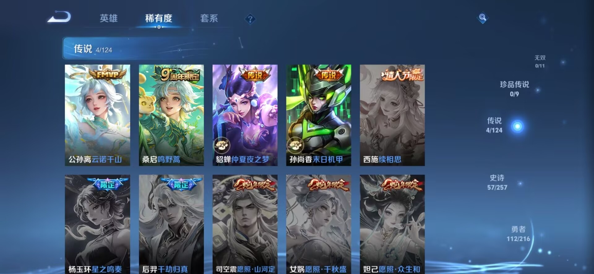 - [11522463]V7 1典藏 1无双 2珍品传说 13传说 123英雄 135皮肤 可修改实名 优质装备:鸣剑·曳影,器灵·螭龙剑,器灵·落星盏,地狱之眼,山海·炽霜斩(李信年限),燃星之曲,浮生妄 珍品传说:时之奇旅-孙策 传说皮:星之鸣奏,祥瑞亨通,幻光神枪 珍宝阁皮:女武神 限定皮:愿照·九州拓(澜年限),愿照·岁时盈(虞姬年限),愿照·山河定(司空震年限),愿照·千秋盛(女娲年限),鸣野蒿,时雨天司(水龙头),遇见飞天 史诗皮:鸭鸭历险记-刘禅,苍鳞隐世,器灵·浮梦炉,化蝶舞,龙之律动,石田雨龙,百相守梦-周瑜,茶境仙,百相守梦-百里守约,百相守梦-黄忠,紫霞仙子,千年之狐,电玩·爆裂旋风,江河有灵,雪夜绮愿(周瑜),龙骑士(小龙虾),暗夜猫娘,晚萤,末日机甲-吕布,时之恋人-孙尚香,节奏热浪,女仆咖啡,摇滚巨星,水果甜心,星夜王子,心灵骇客,幽灵船长,乐园奇幻夜,纤云弄巧,逐浪之夏,水晶猎龙者,箭羽风息,圣诞恋歌,鹰眼统帅,魅力维加斯,黎明之约